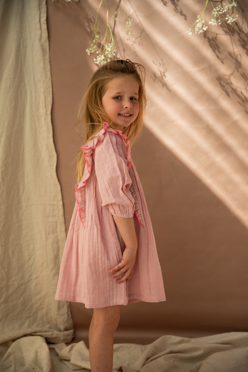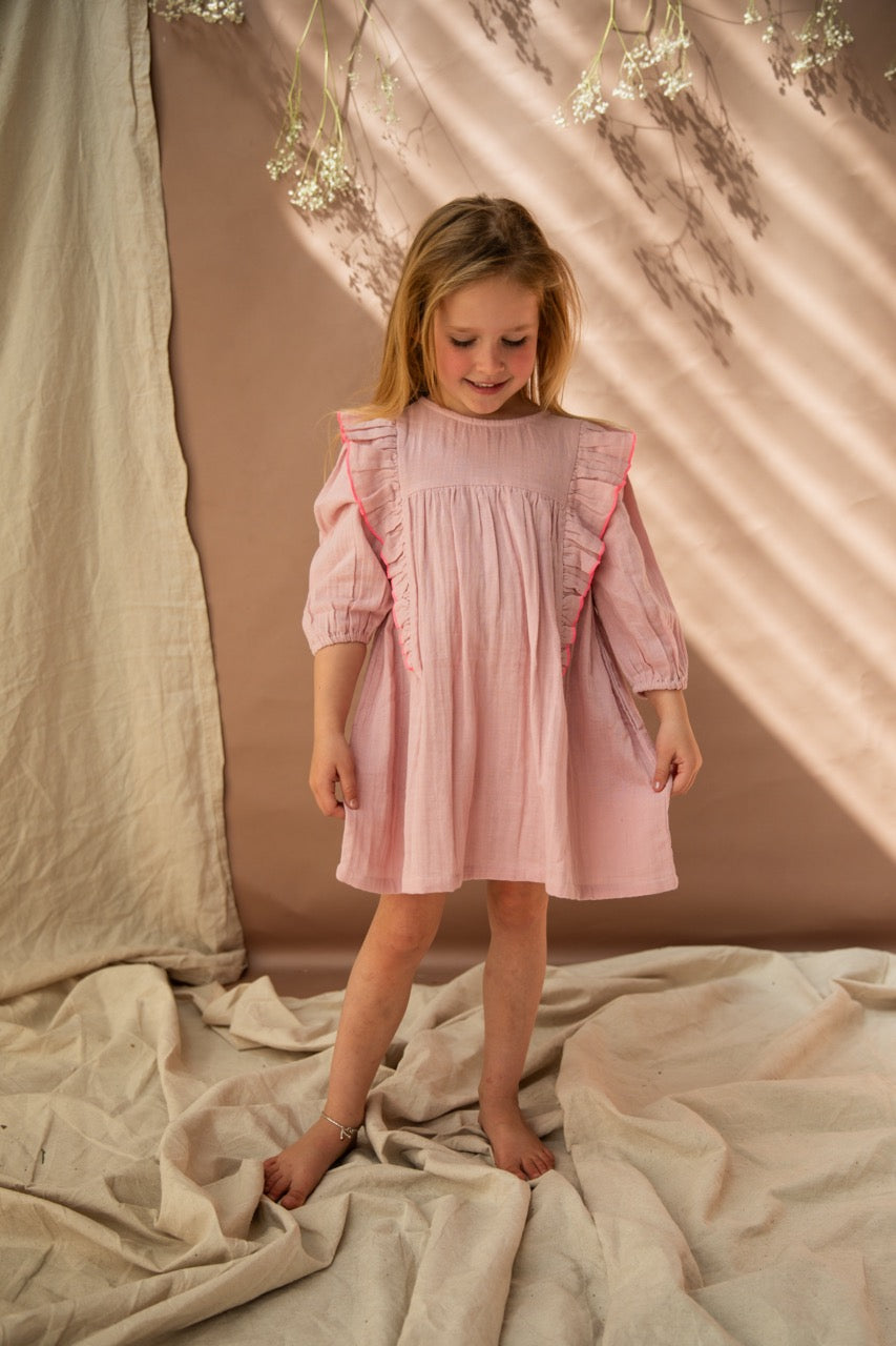 Pretty as a picture and twirly girl ready, but don’t worry Bella & Lace didn’t forget the pockets! The beautiful Agatha Dress in Pink Lady Apple features full sleeves with elasticated cuffs, gold button back closure, front panel ruffles and is adyed to perfection double gauze, accented with neon pink trim. Layer over leggings for extra warmth. Perfect to match sisters with the Primrose romper.
