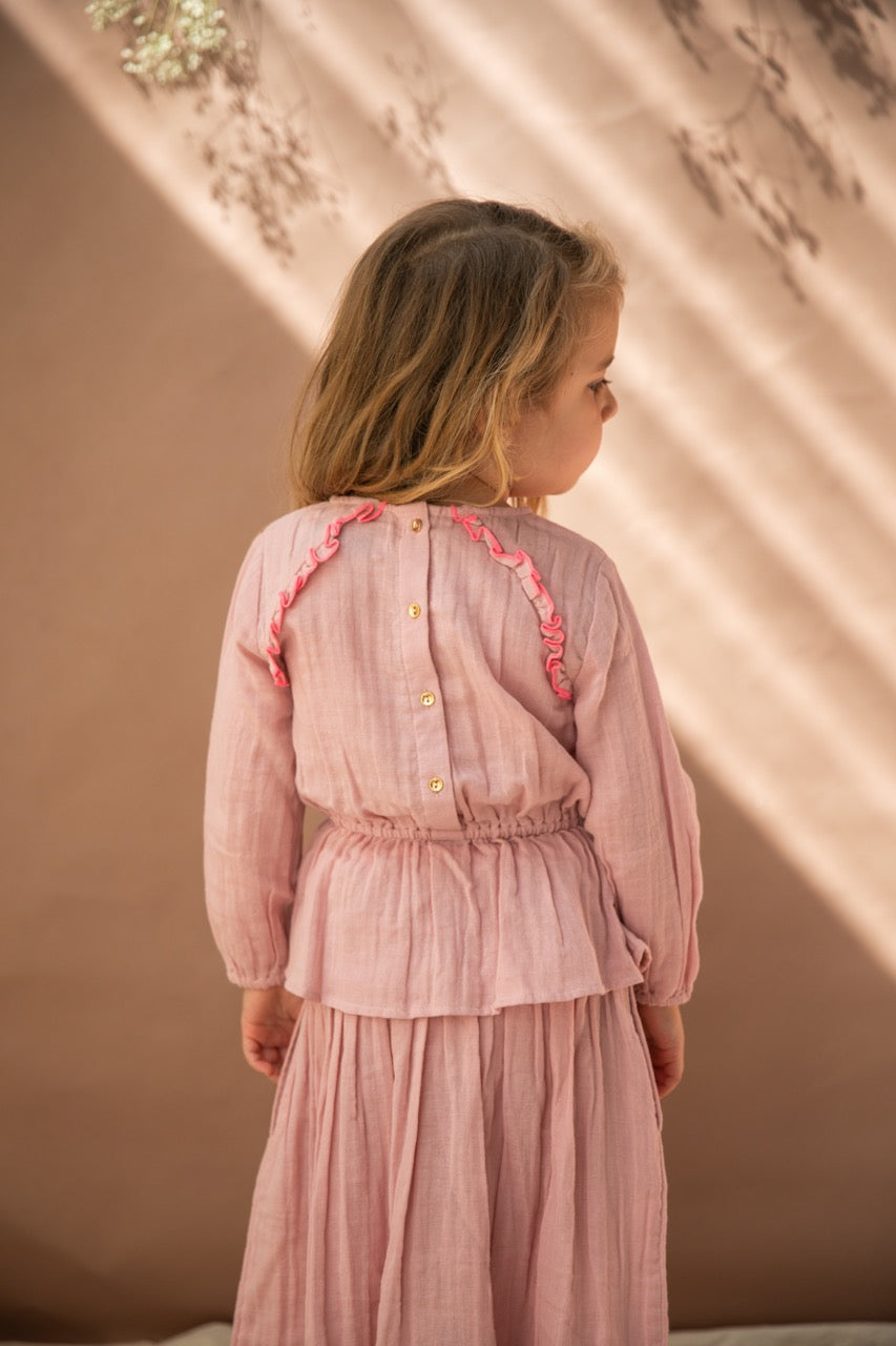 The gorgeous Hazel Top in Pink Lady Apple from Bella & Lace is beautifully versatile and the perfect amount of girly paired with Jeans or make it a matching set, with the Mildred skirt. Featuring a stunning gold button back closure, full sleeves, softly gathered elastic waist and shoulder ruffles. Crafted in a dyed to perfection double gauze, accented with neon pink trim. Your little love is sure to adore this beauty.