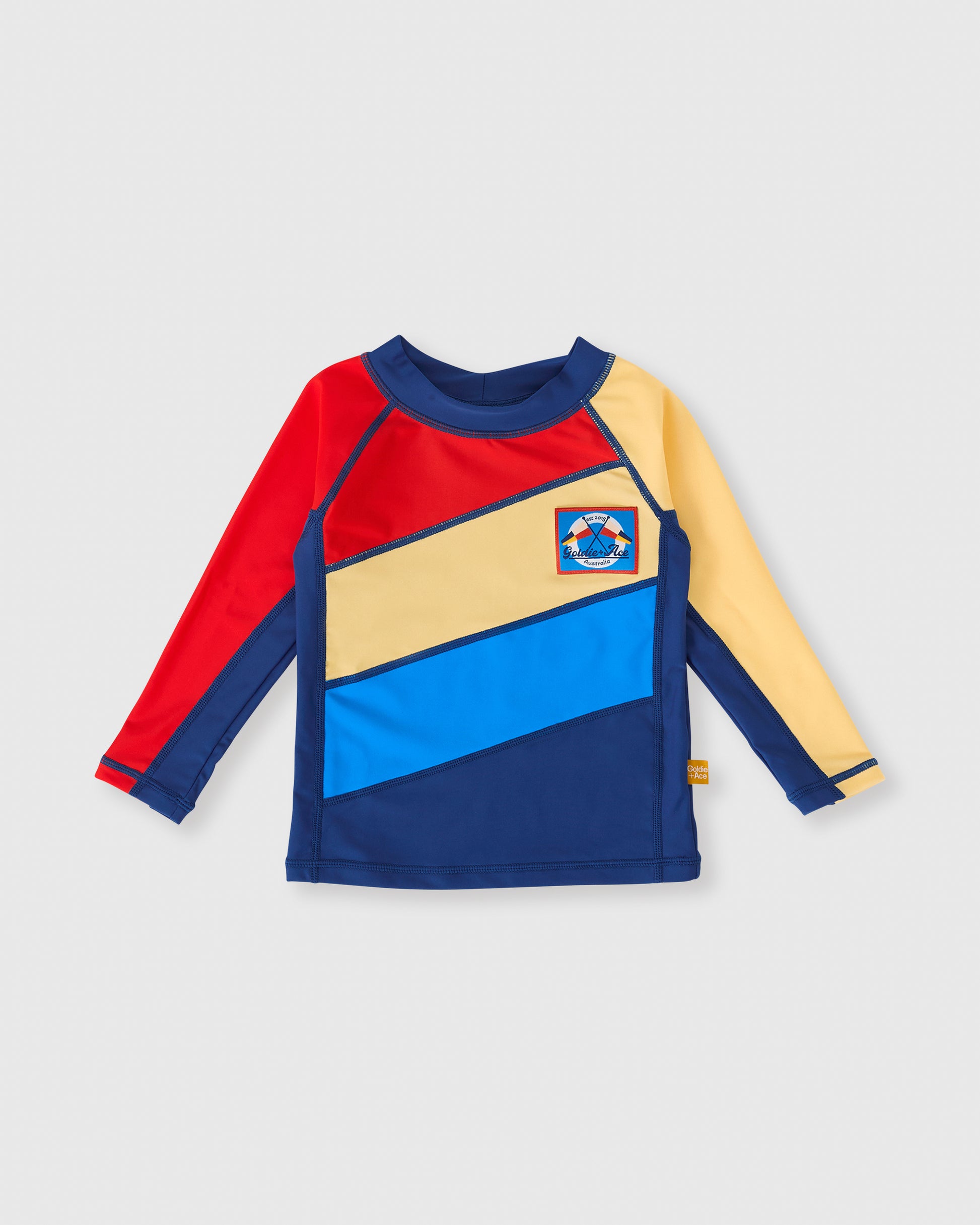 Blue long-sleeve rashguard with nautical-colour panels and a special G+A badge – keeps little ones comfy while they splash and play.