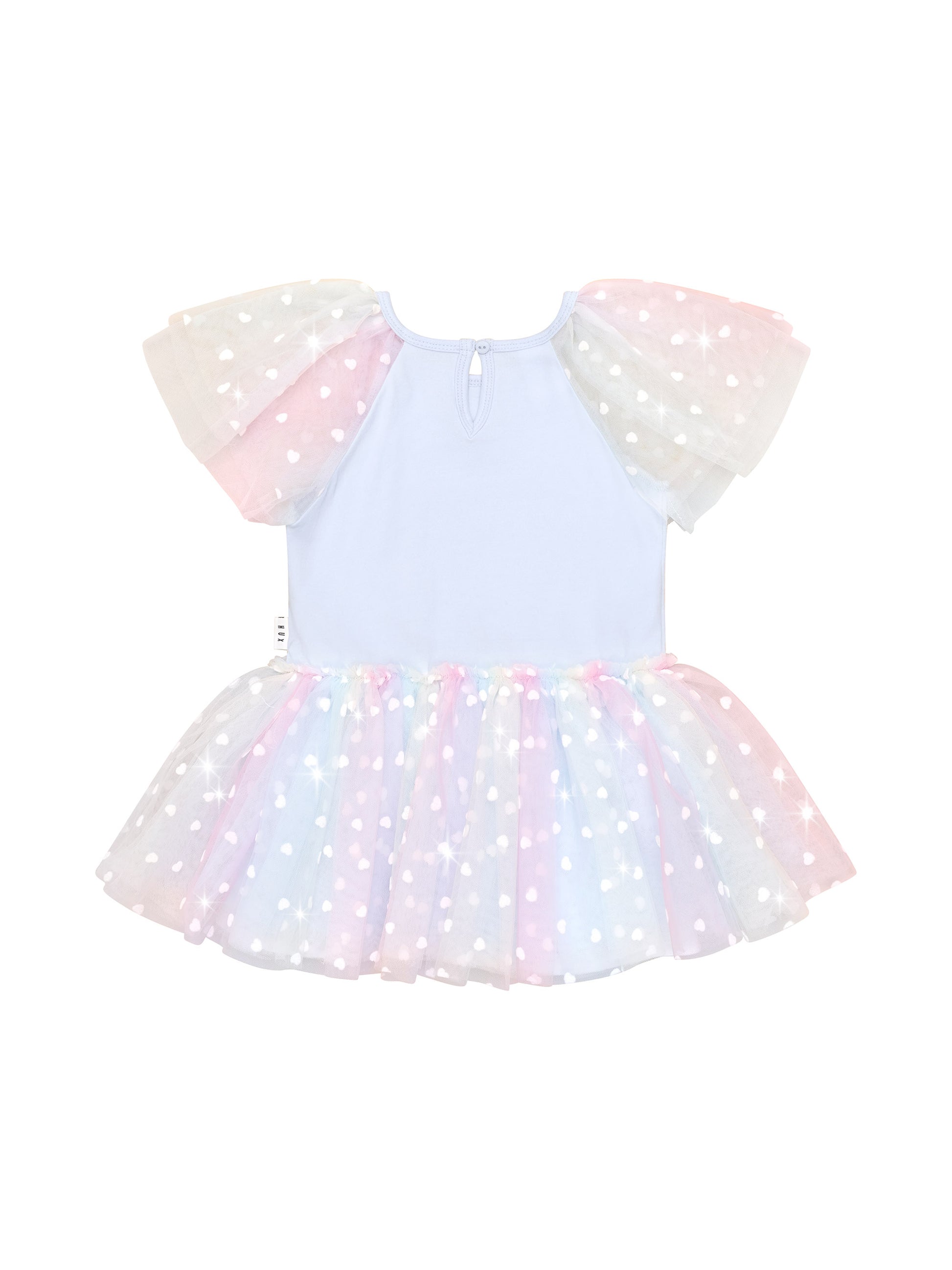 - Flutter unicorn ballet dress with layered pastel rainbow tulle sleeves and all over heart flock print