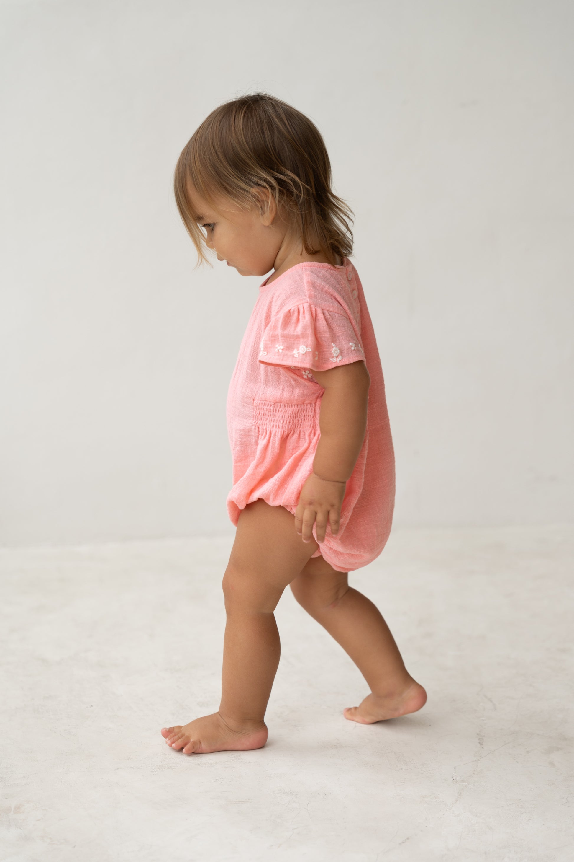 The sweetest little onesie with elevated, hand-embroidered floral trim along the sleeves. The Blossom Romper in a lovely Coral hue from Illoura The Label is crafted from natural cotton, the Blossom Romper offers shirred side details and press studs for easy changes.