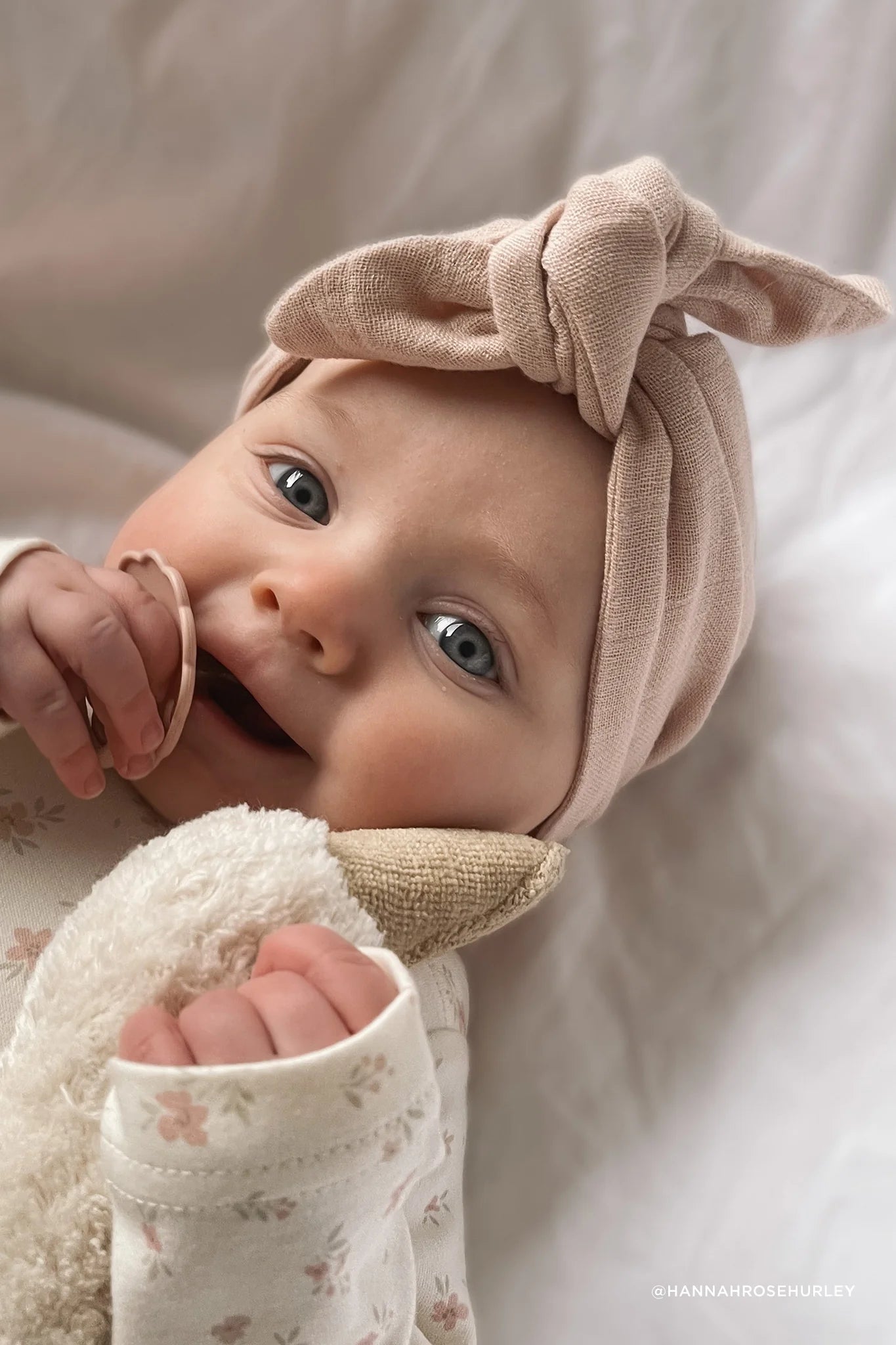 The Jamie Kay Organic Cotton Muslin Headband in Misty Pink. This adjustable headband is crafted from high-quality organic muslin cotton, creating a soft and breathable material that won't irritate or cause discomfort.