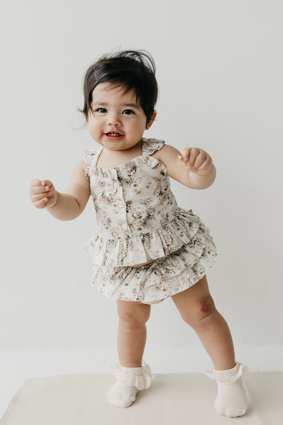Introducing the beautiful Organic Cotton Gemima Top in Esme Floral from Jamie Kay's Esme collection this surely be a favourite staple piece. This lovely flutter singlet top is a slightly cropped style with buttons down the front for easy changing, a sweetheart frill neckline and a sweet peplum frill detail.