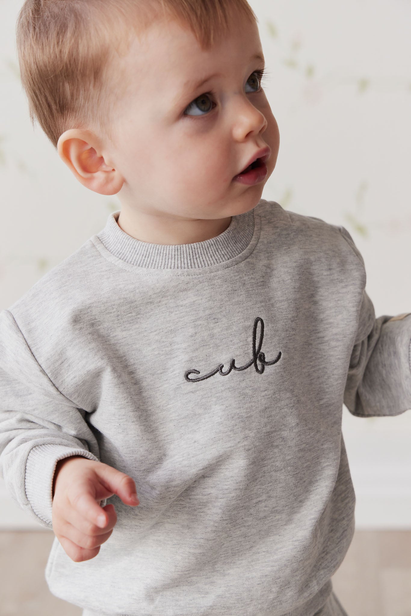 This signature reimagined style Jamie Kay Organic Cotton Jalen Sweatshirt in Light Grey Marle is the perfect essential across the seasons. Designed to pair with the Jalen shorts for a complete look, this staple wardrobe piece is perfect for the active little love in your life. An easy wearing top, this pullover style sweatshirt is a cute new style crafted from the perfect fabric blend for year round comfort and features a snap dome opening on sizes 0-3 months to 2 years for easy dressing. Featuring the 'Cub' script embroidered on the front.