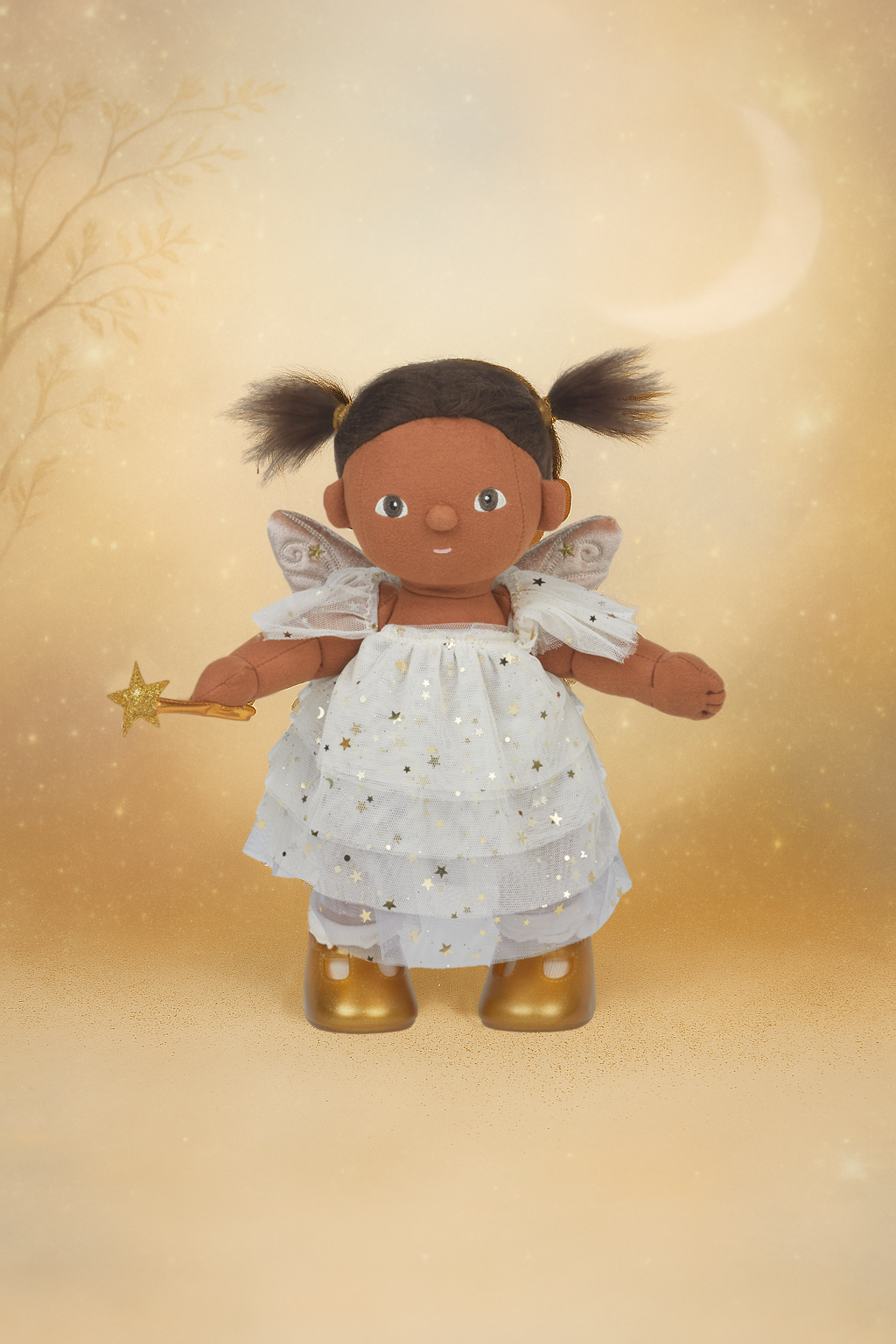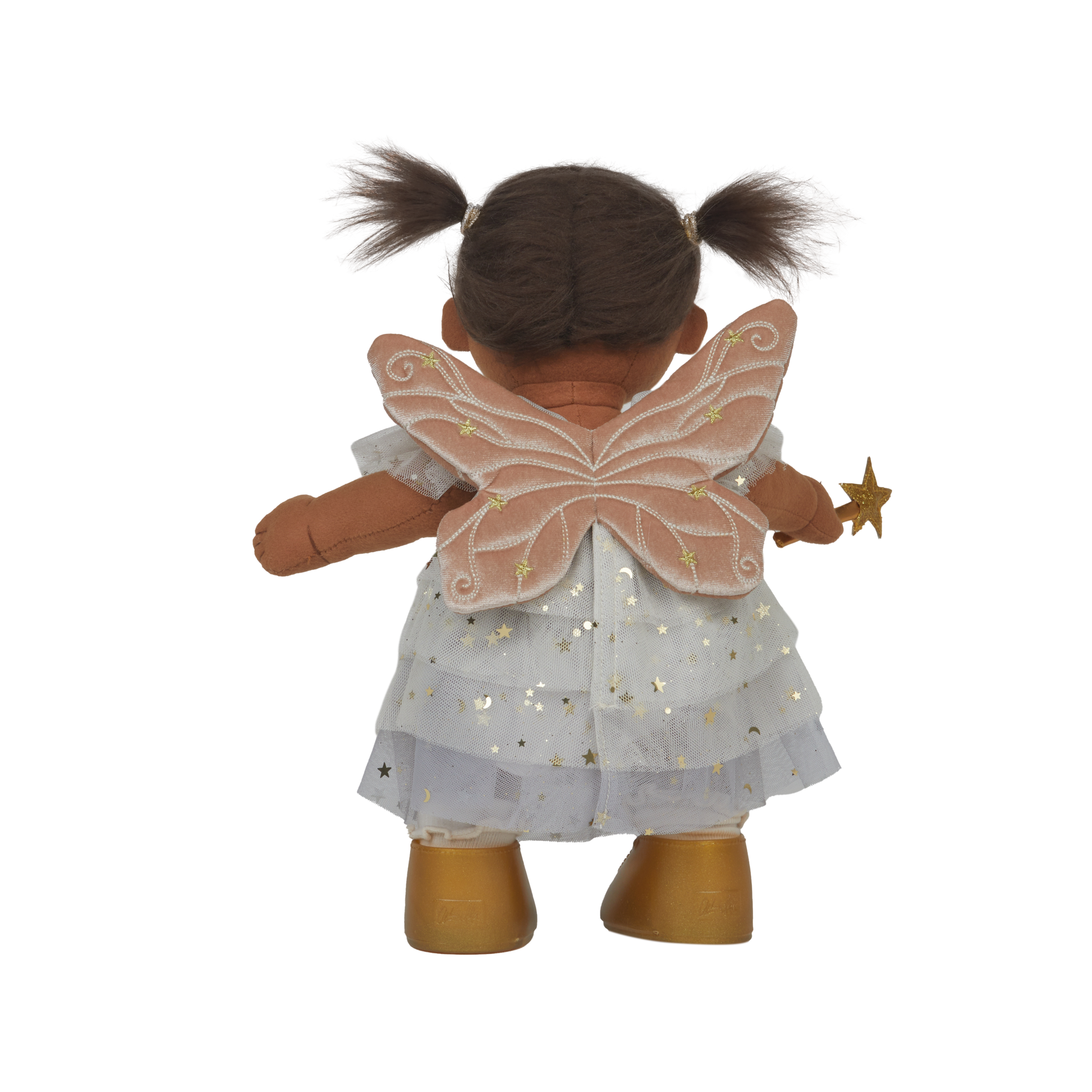 With magnets hidden in her hands, Freya can hold her star wand, fairy snacks, or even a tiny unicorn - ready for any adventure. Her plush wings shimmer with every spin, and her glittery shoes are made for stardust-stomping and fairy footwork. She’s dressed to enchant in a tulle dress and frilly socks, and her soft cotton body is perfect for big squeezes and sweet dreams.