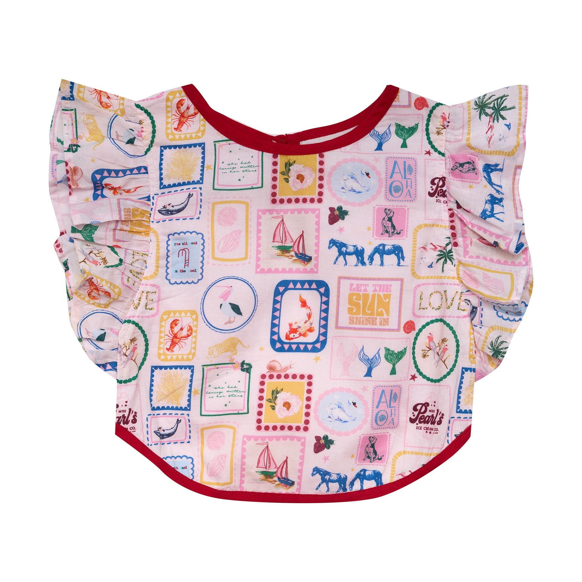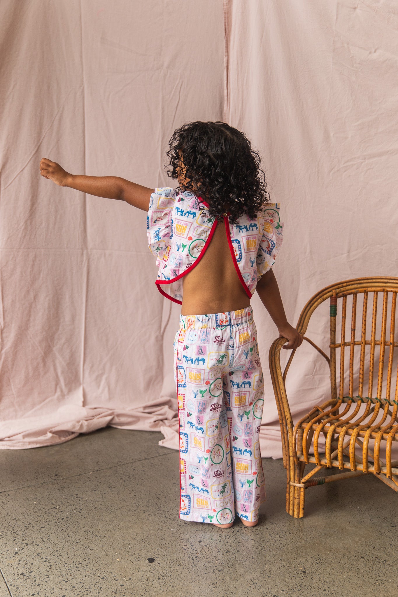 This sweet top features fluttery sleeves, finished with vibrant red trim and open back to catch the summer breeze in our A Love Letter print on light cotton voile. Pair it back with skirts, shorts or pants.