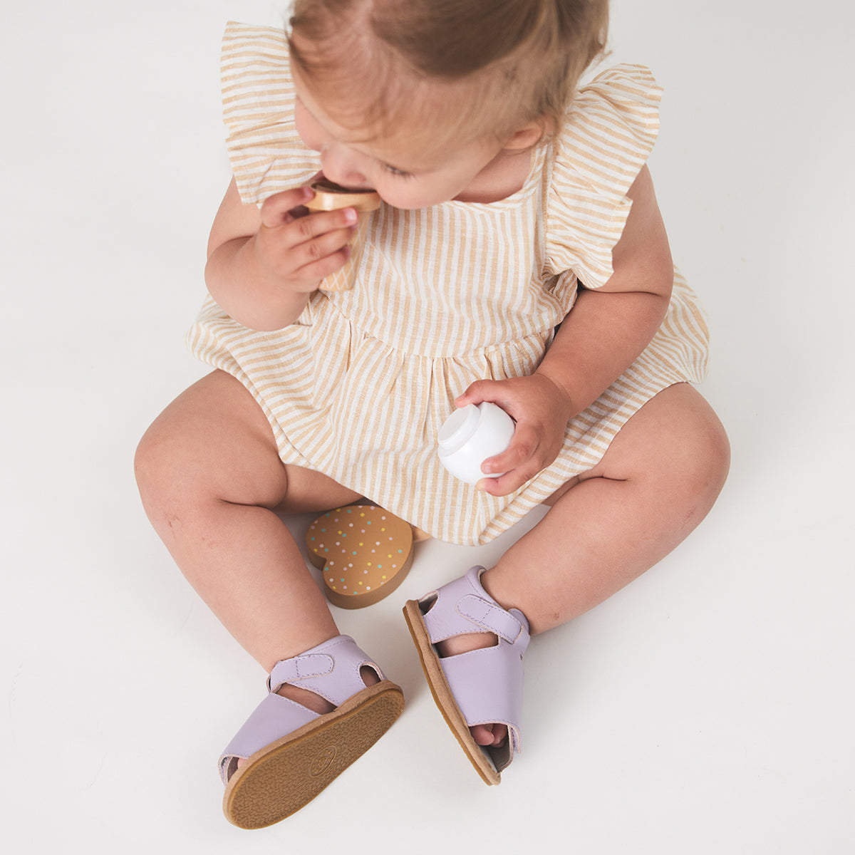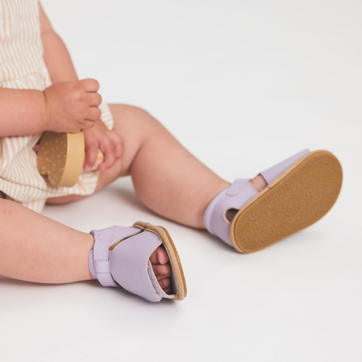 The Phoenix shoe in Lilac from Pretty Brave features a fully adjustable front strap and ankle strap making it perfect for growing feet. Designed to fit all foot types, this sandal features a padded collar and cute cut out detailing at the sides.