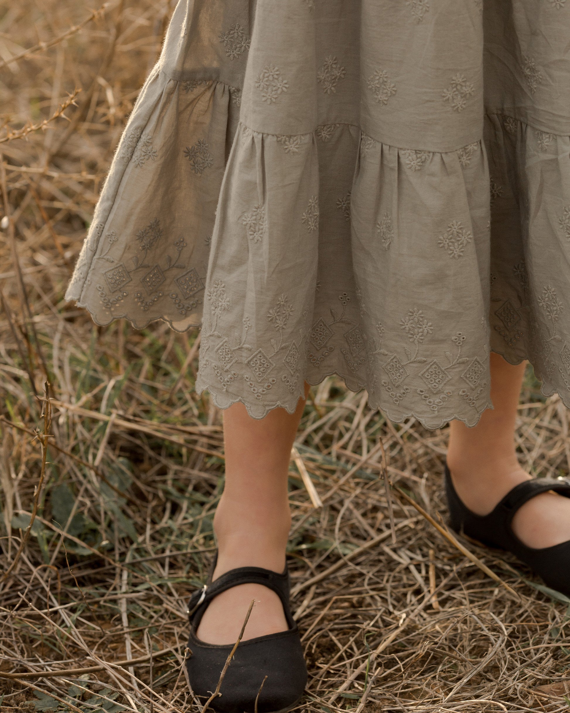 The beautiful Ruffle Tiered Midi Skirt in Laurel from Rylee + Cru is a Mid-length tiered skirt with an embroidered scallop edge and an elastic waistband.