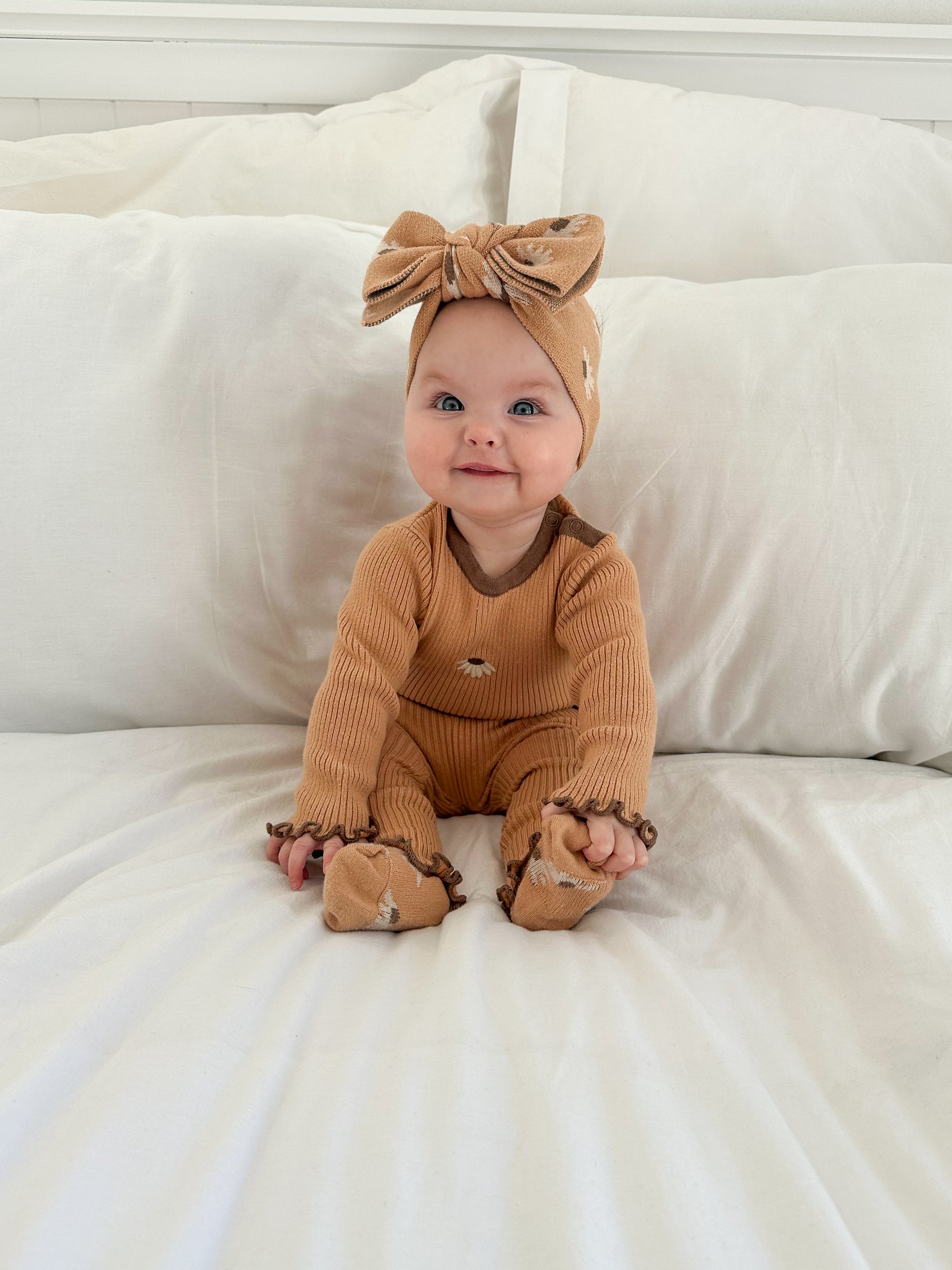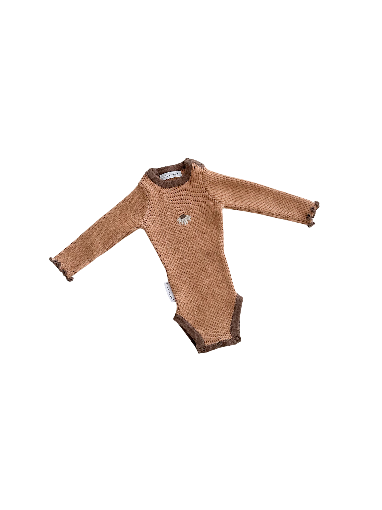 Ribbed, long sleeve bodysuit featuring embroidered Hazel flower on the front. Functional press snaps at crotch for easy nappy changes and press snaps on shoulder for easy on/off. Match with our Hazel Collection.