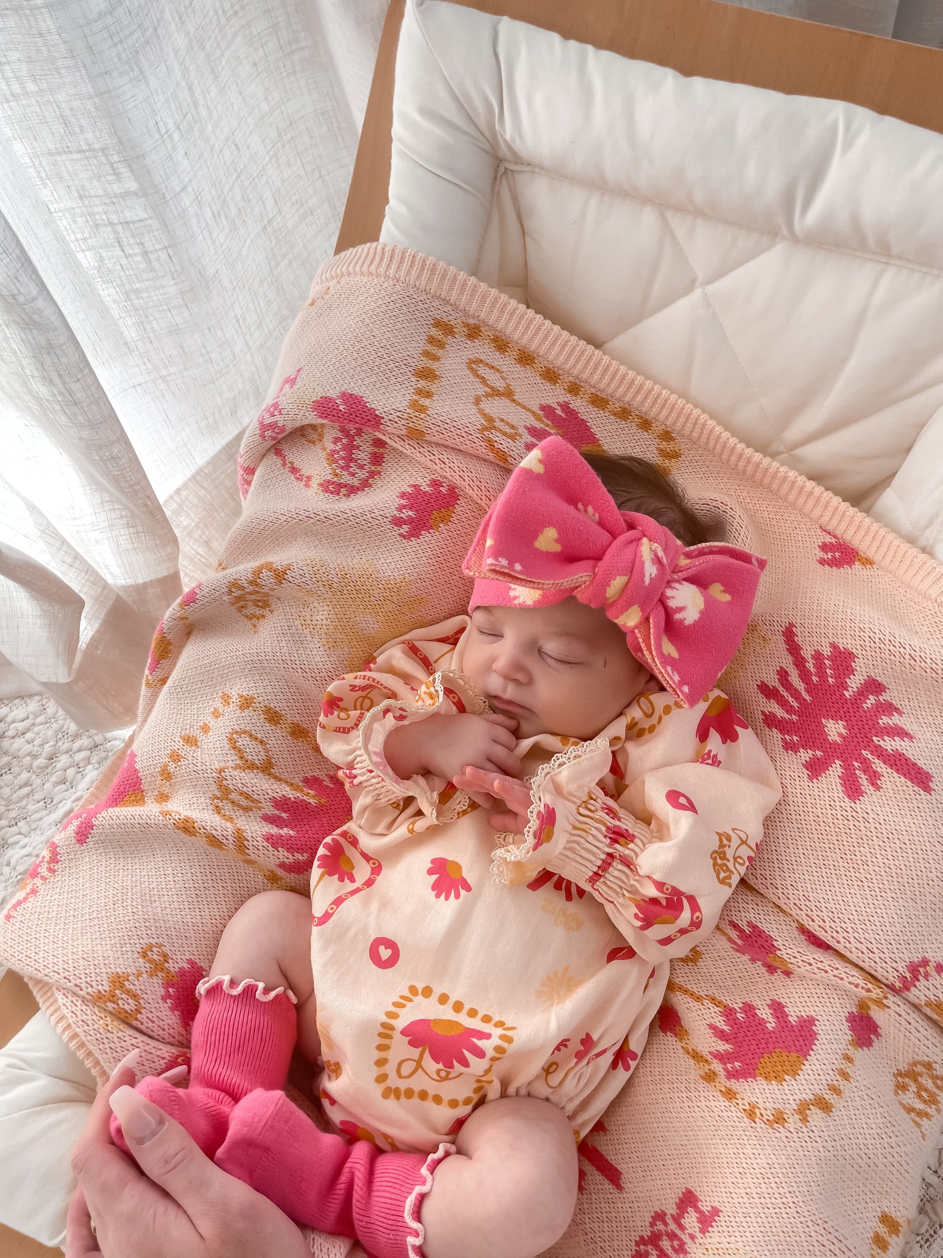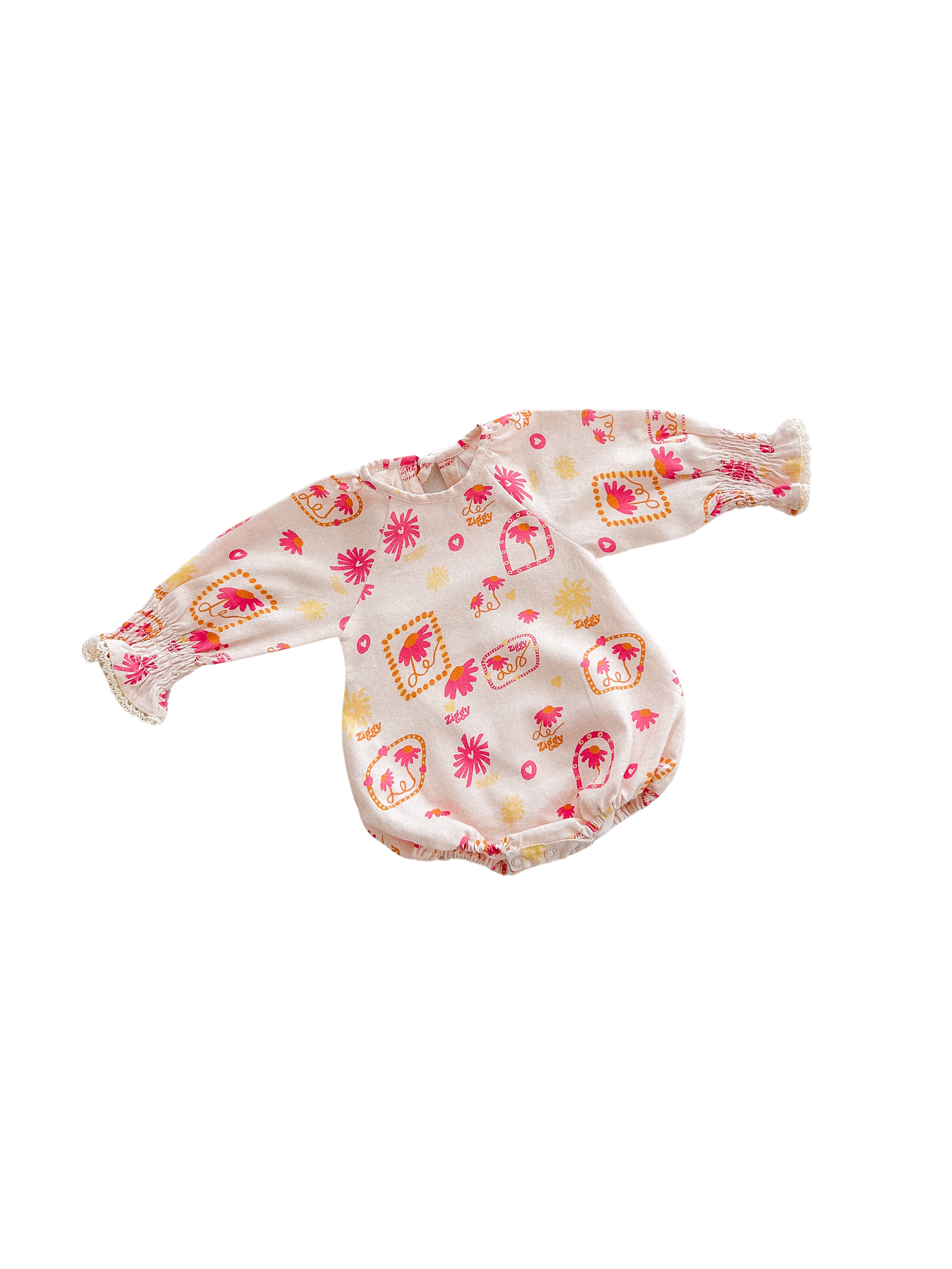 A lightweight linen blend romper featuring our Marlow printed design. Shirred cuffs with lace detail and functional button closure on the back of neck and snaps at the crotch for easy on/off and nappy changes.