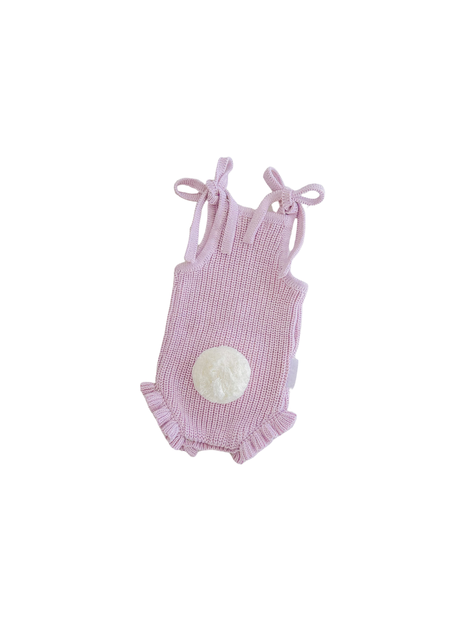 Chunky knit frill bodysuit in our two tone Bamby colour featuring a removable bunny tail (press snap). Frill leg detail and adjustable ties at shoulder. Press snaps at crotch for easy nappy changes. Match with items from our Bamby Easter Collection.