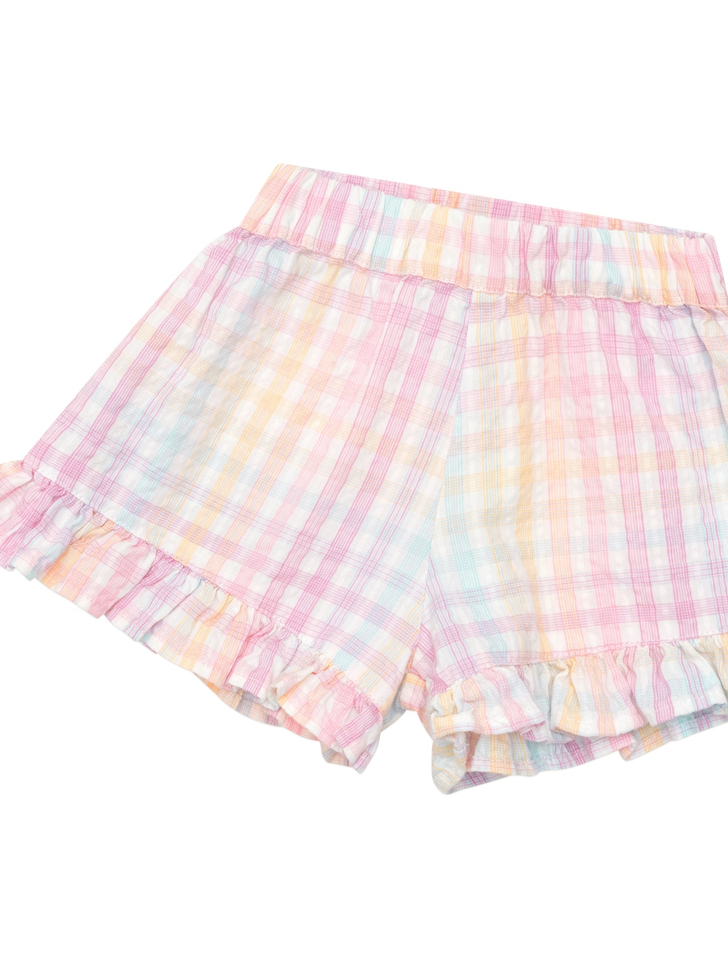 Introducing the Huxbaby Rainbow Check Skort, featuring a relaxed fit, soft elastic waistband, and a playful rainbow check pattern. Made from cotton seersucker yarn dye, this skort also includes a pocket on the back and adorable unicorn embroidery. Comfortable and stylish, perfect for any casual occasion.