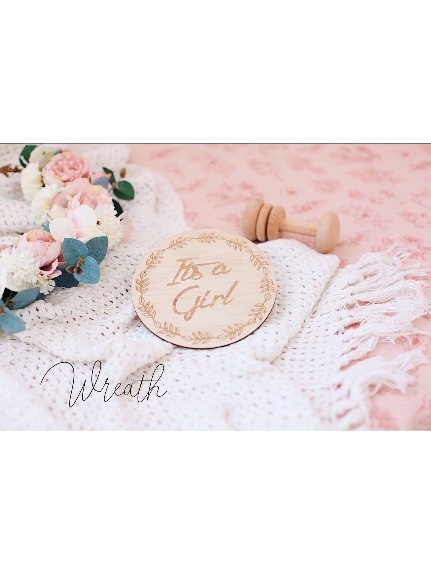 A unique and modern way to mark your memories and share your baby's milestone announcement, the "It's a Girl" Wreath single announcement disc from Hello Fern makes the perfect addition to your images, flatlays, shelves or nursery to tell and share your story with friends and family.