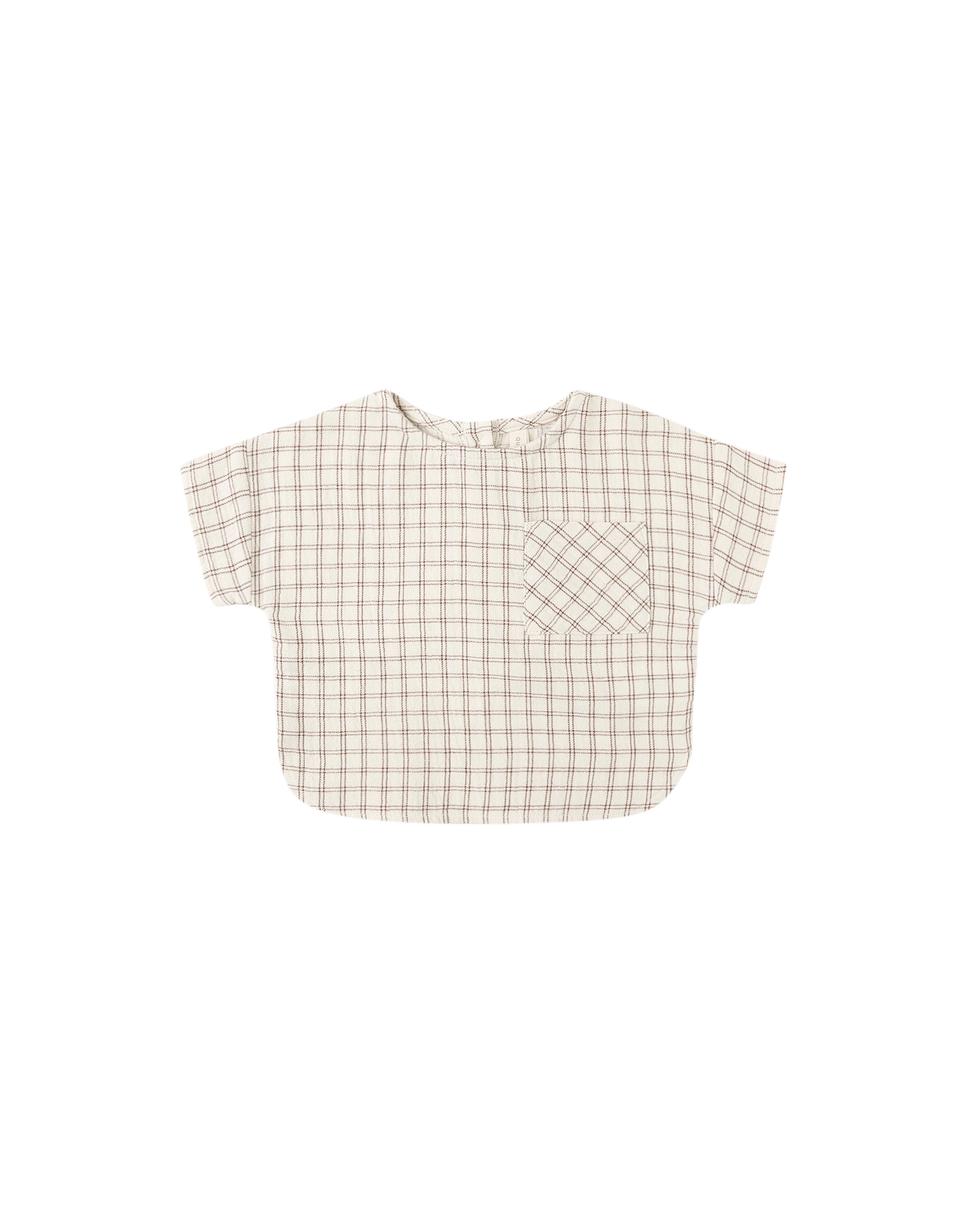 Woven boxy-fit top featuring a front chest pocket and back coconut button placket for easy on and off.