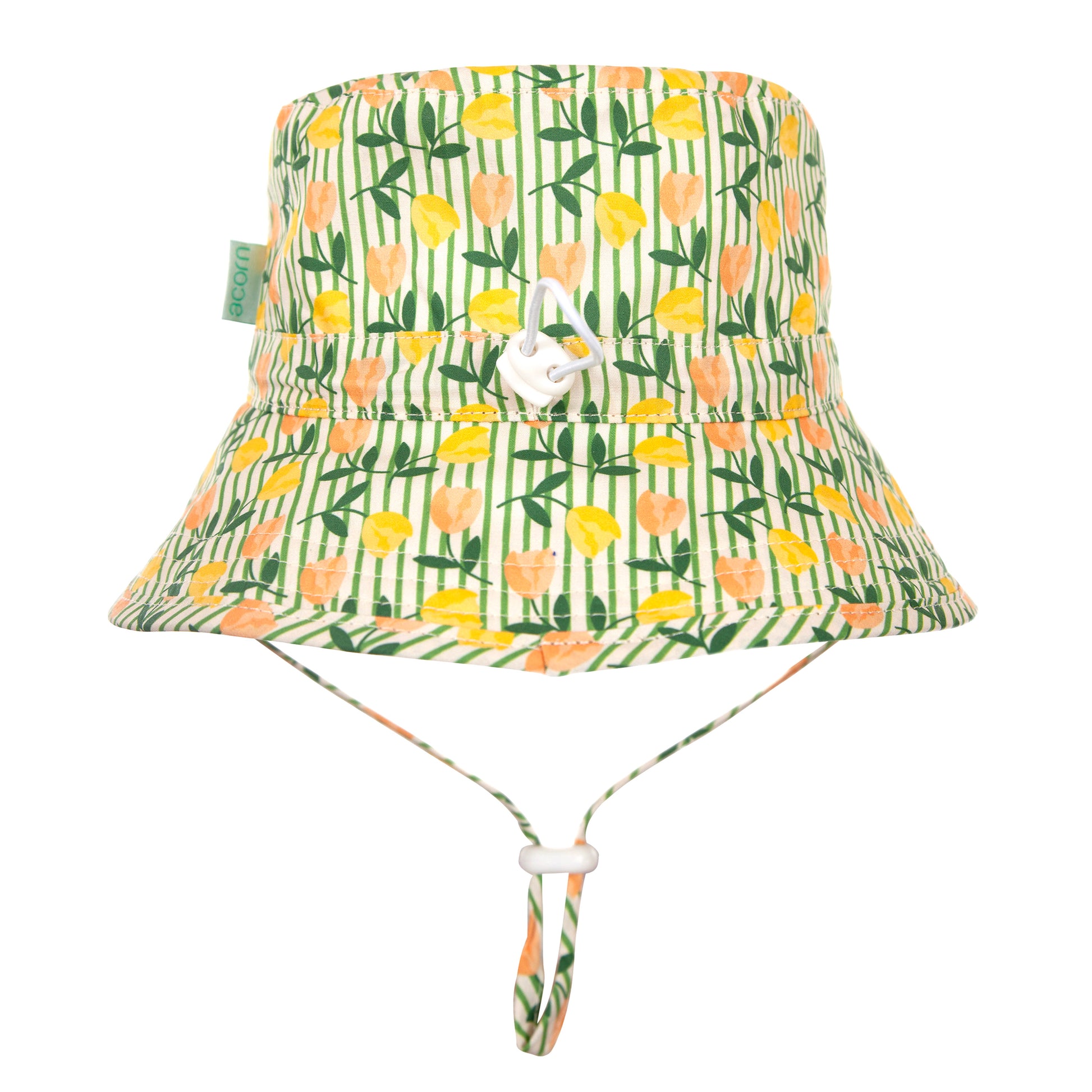 Introducing the Acorn Broad Brim Bucket Hat Tulip, a playful and stylish choice for sunny days. This hat features a unique tulip floral print designed by artist Jacinta Wier. With an elasticated toggle for a perfect fit and cord and toggle to keep it in place, this hat also provides UPF50+ sun protection. Available in sizes S-XL with a wide brim, it's the perfect accessory for any outdoor adventure.
