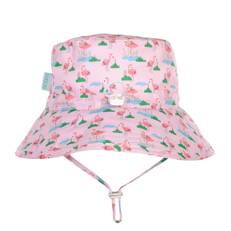This Trendy Dancing Flamingo from Acorn Bucket hat with a sweet pink coloured base, a dancing flamingo design and blue and white polka dot print on the inner brim. Print designed and hand drawn by local artist, Jacinta Weir from Two Little Ducklings. Elasticated toggle around the head for the perfect fit. Cord and toggle under the chin to keep the hat in place.