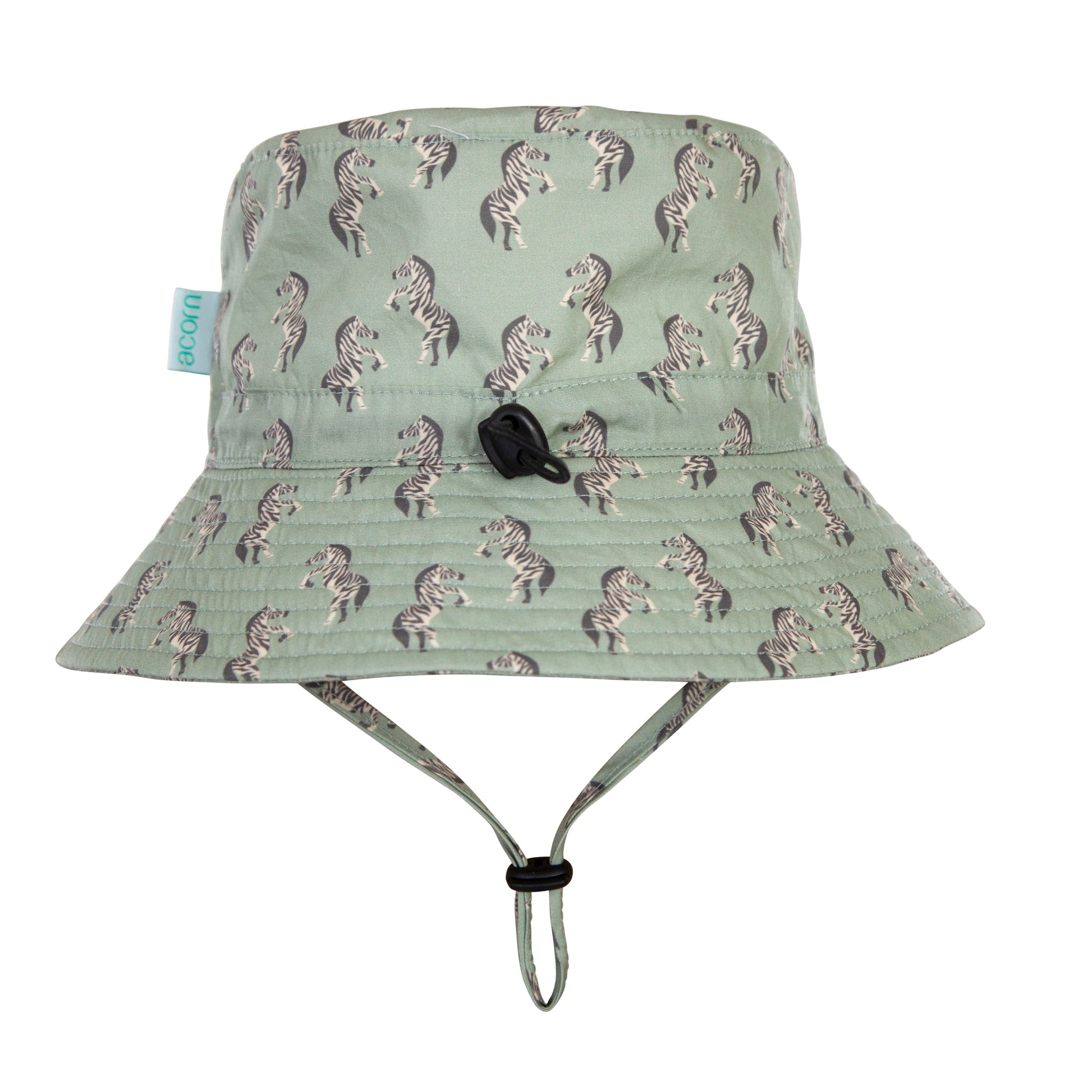 The stylish Acorn Bucket Hat in Dancing Zebra provides UPF50+ protection from the sun. Featuring a unique khaki based dancing Zebra print designed by local artist Jacinta Wier from Two Little Ducklings witha wide brim and an elasticated toggle for a perfect fit, it also has a cord and toggle under the chin for a secure fit. The wide brim measures 6-7.5 cm depending on size. Crafted from 100% cotton, this hat is sure to be a hit.