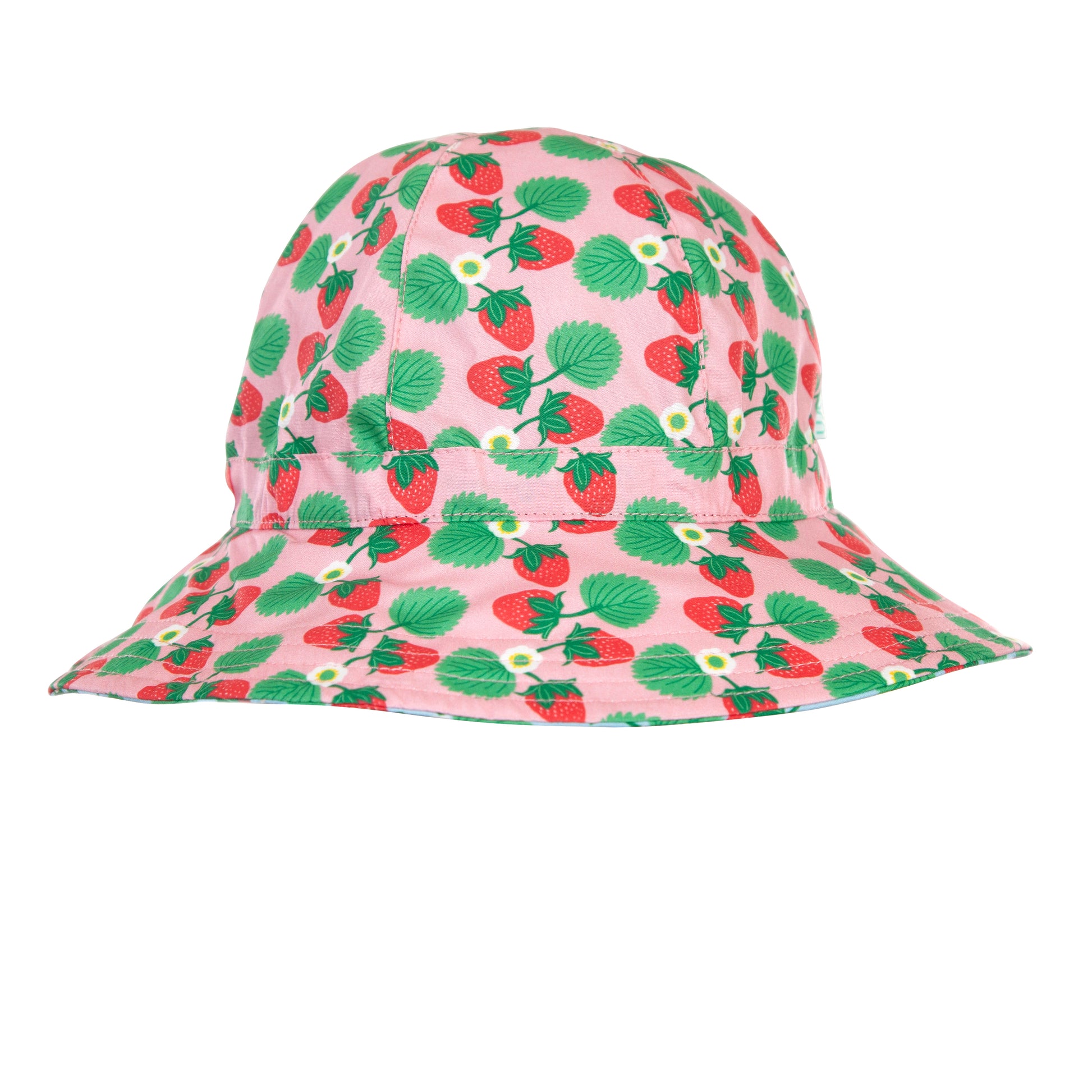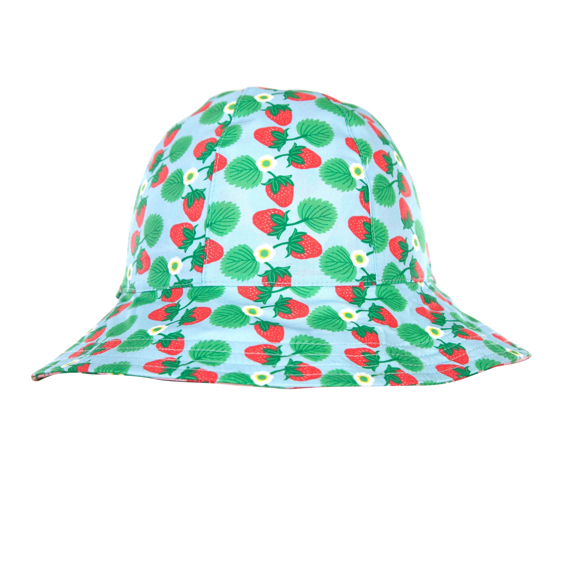 - Reversible sunhat with a pink strawberry print on the outside and a blue strawberry print on the reverse, both prints are designed by Jacinta Weir from Two Little Ducklings.