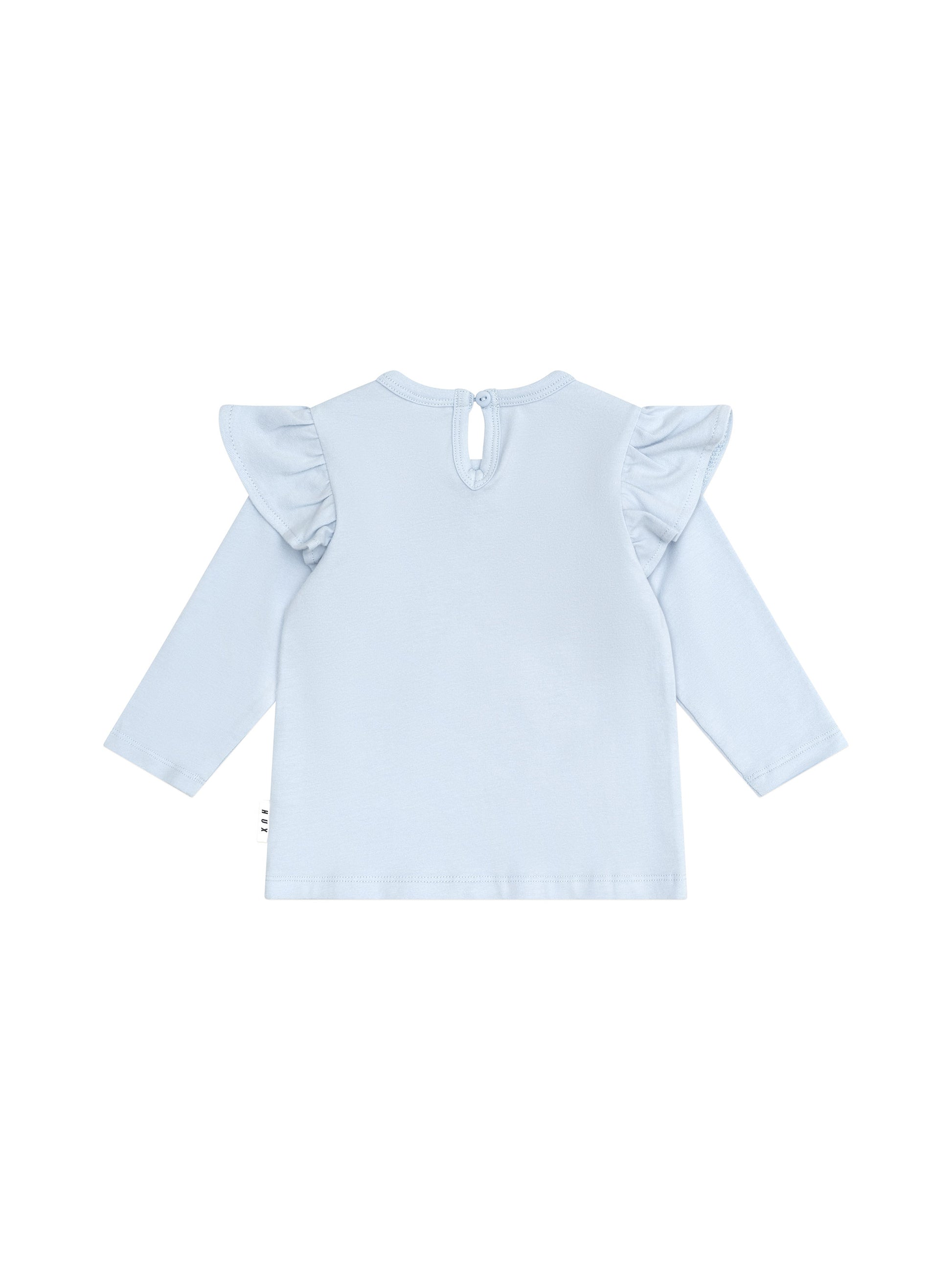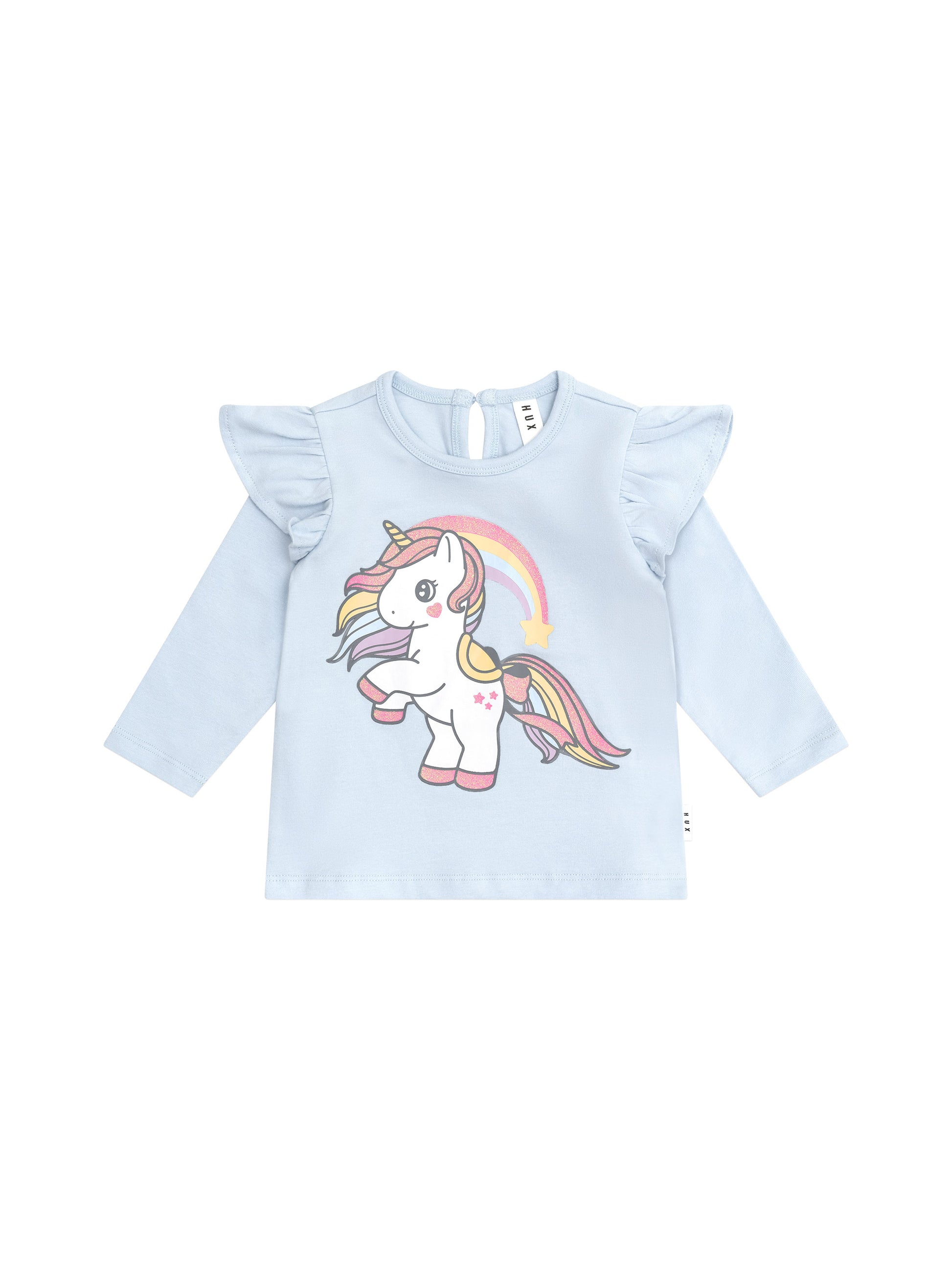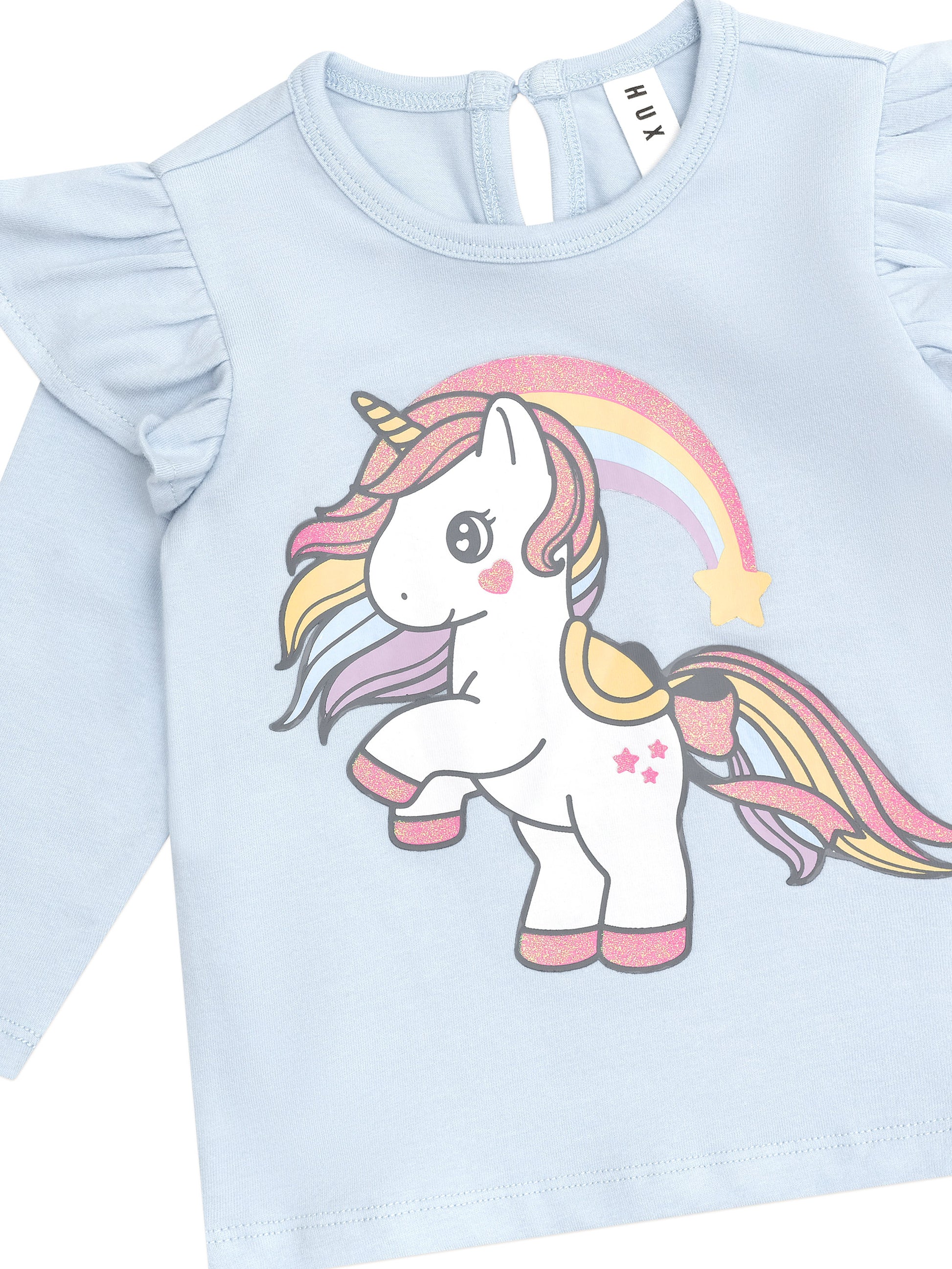 Create a magical wardrobe for your little one with Huxbaby's Rainbow Unicorn Frill Top in Ice Water! Made from soft, premium organic cotton, this long sleeve top features a playful rainbow unicorn print with a touch of pink glitter. Its keyhole closure and sustainable production make it a comfortable and stylish choice for your child.