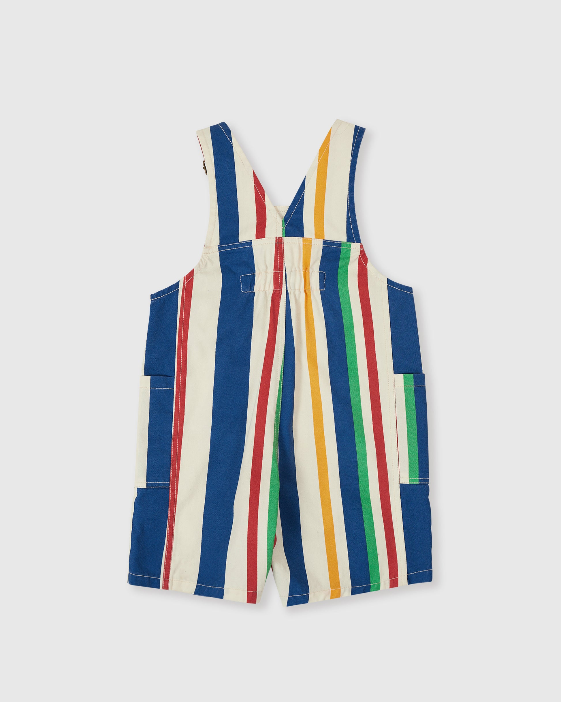 True to size. Relaxed fit. The addition of functional wrap around pockets adds a fun twist to a classic shape. Adjustable straps with brass clasps for room to grow and leg snaps up to a size 2 for easy dressing. In-house designed stripe.