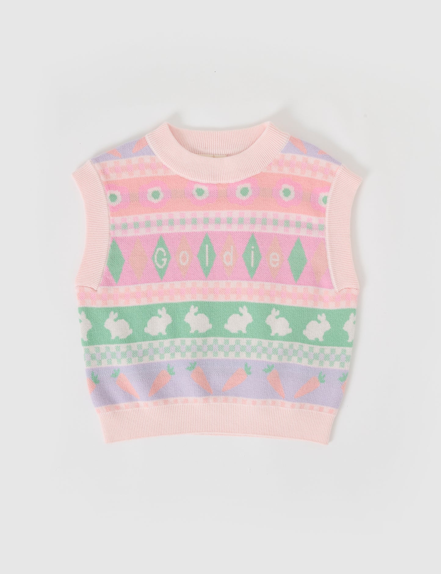 True to size. Super soft wool blend, jacquard knit sweater vest featuring a super cute bunny/flower/carrot design. A perfect cosy layering piece.