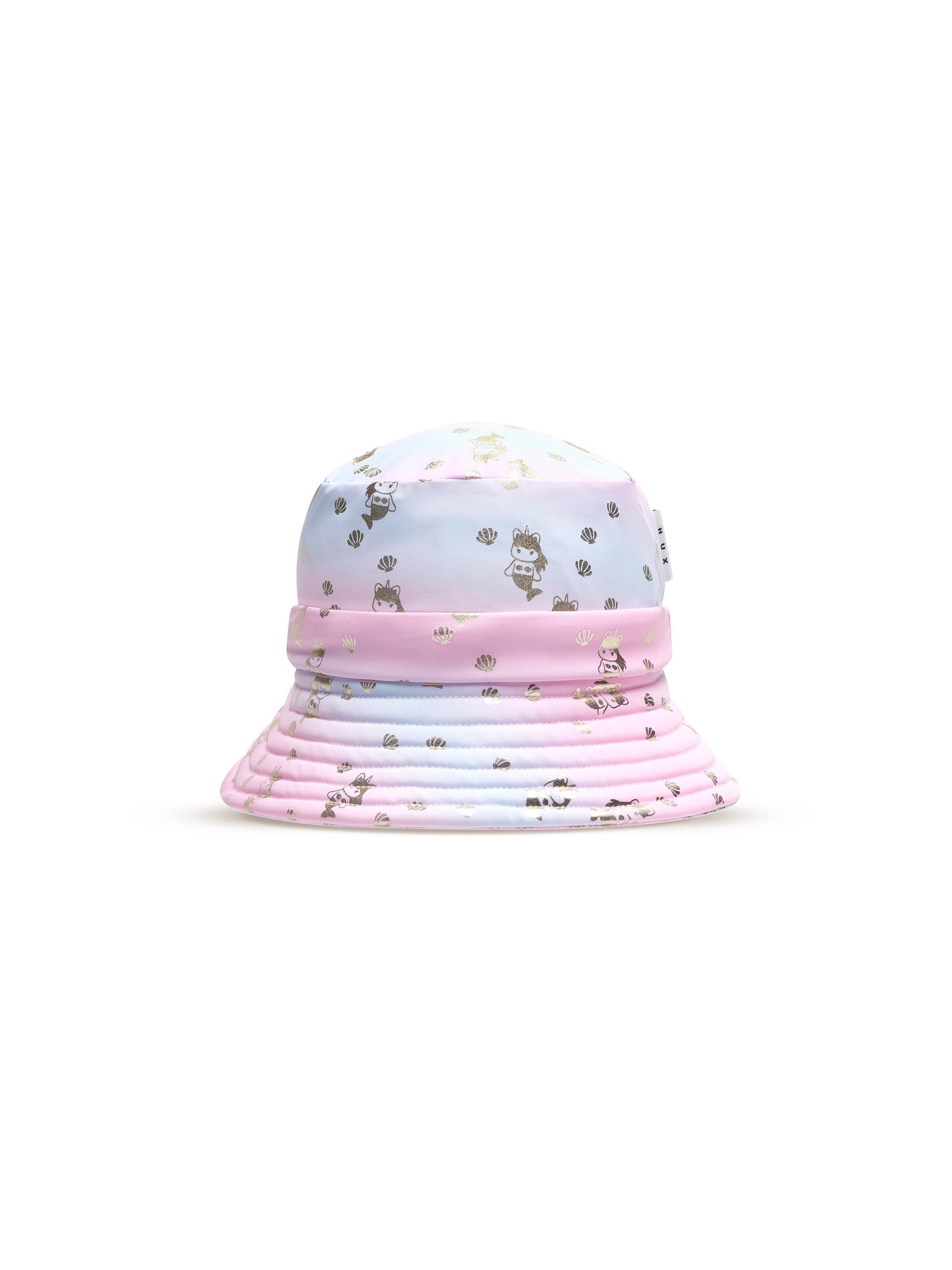 - Wide brim sun hat with all over sea rainbow print and gold foil daisy seashell print
