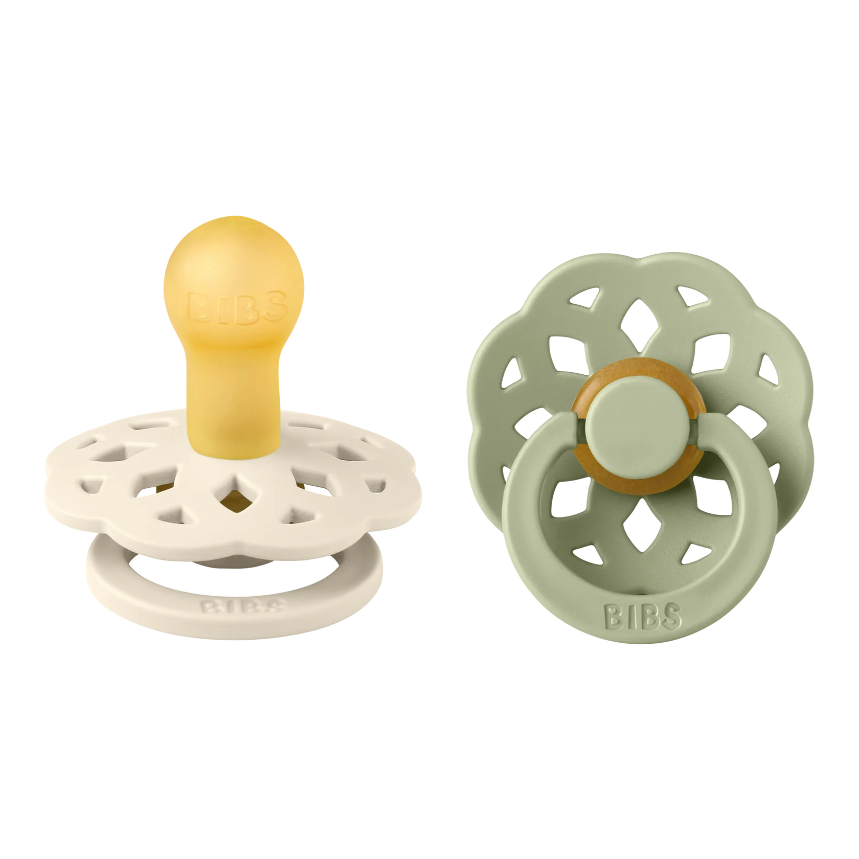 A fantastic pack of 2 Boheme Pacifiers by Bibs Dummies in Ivory/Sage. The Boheme pacifier is inspired by the modern bohemian style. With its natural elements and organic silhouette Boheme appears in a fresh, creative, and aesthetic design.