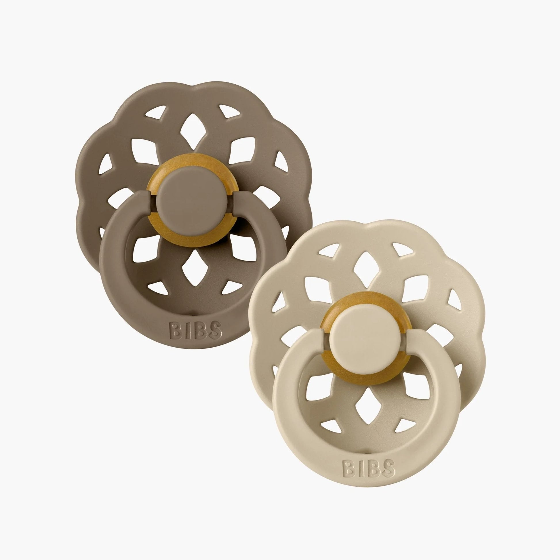 A fantastic pack of 2 Boheme Pacifiers by Bibs Dummies in Vanilla/Dark Oak. The Boheme pacifier is inspired by the modern bohemian style. With its natural elements and organic silhouette Boheme appears in a fresh, creative, and aesthetic design.
