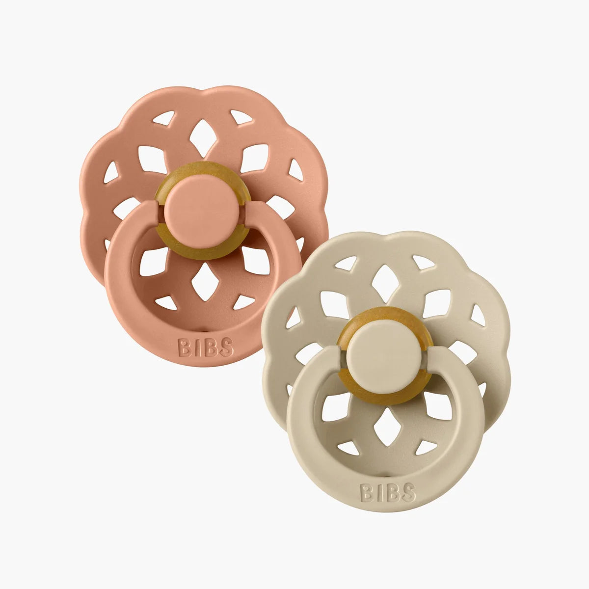A fantastic pack of 2 Boheme Pacifiers by Bibs Dummies in Vanilla/Peach. The Boheme pacifier is inspired by the modern bohemian style. With its natural elements and organic silhouette Boheme appears in a fresh, creative, and aesthetic design.