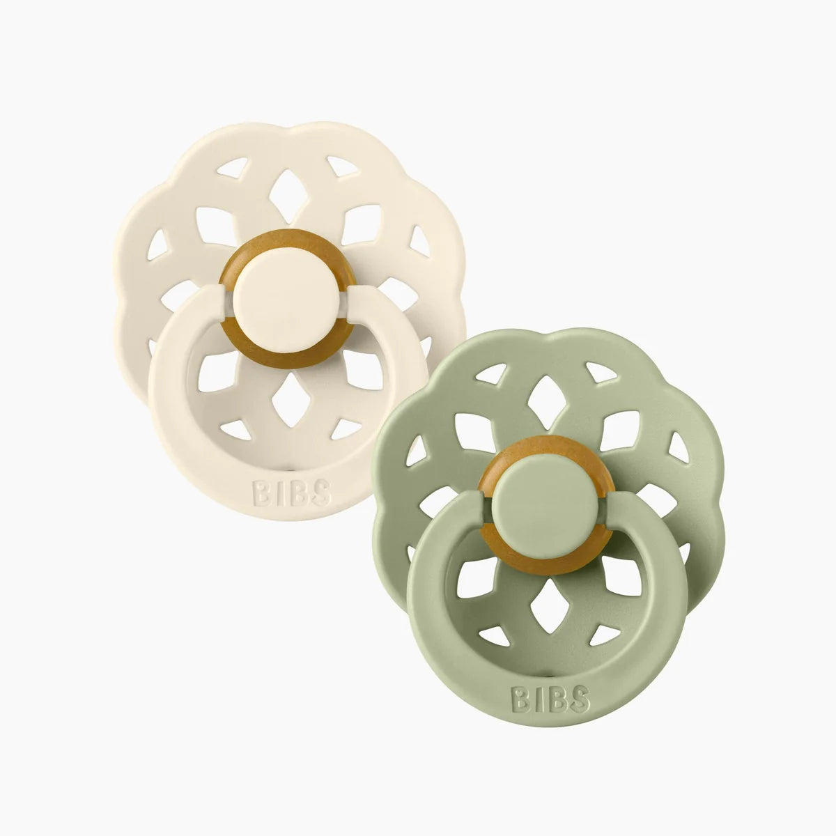A fantastic pack of 2 Boheme Pacifiers by Bibs Dummies in Ivory/Sage. The Boheme pacifier is inspired by the modern bohemian style. With its natural elements and organic silhouette Boheme appears in a fresh, creative, and aesthetic design.
