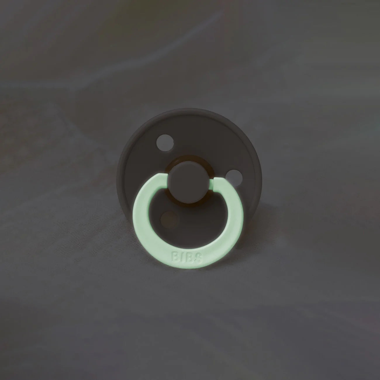 A fantastic pack of 2 Night Glow Pacifiers by Bibs Dummies in Baby Blue. The NIGHT edition from BIBS features Colour Pacifiers with a luminous ring that lights up in the dark, perfect for helping both child and parent find the pacifier if it gets lost! For best results, hold the pacifier towards a lamp for approx. 10 seconds.