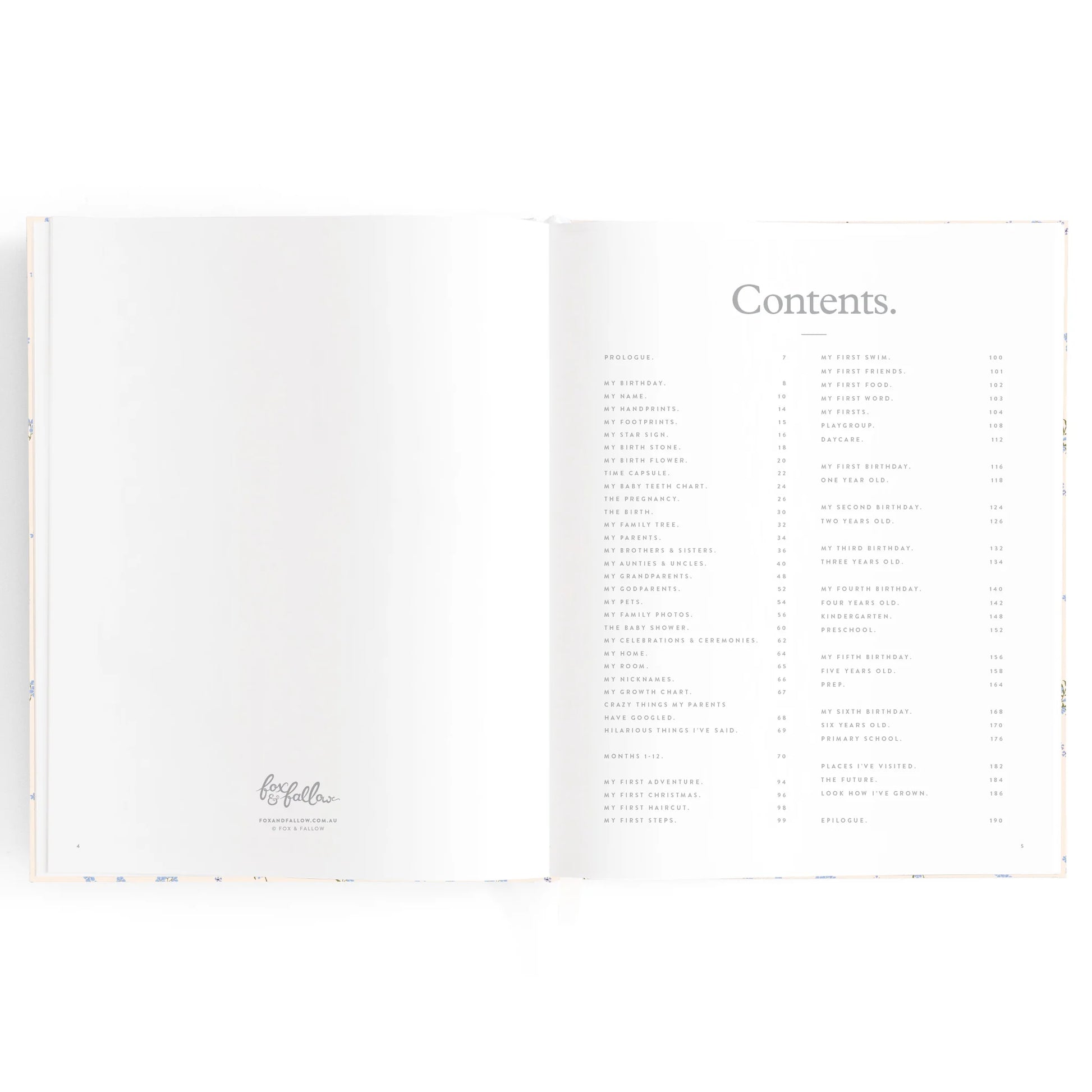 The Fox + Fallow Baby Book in Bellflowe is a beautiful keepsake for the whole family to enjoy. Includes: important milestones and firsts, family profiles, family tree and travel map, playgroup and daycare through to kindy and school years, time capsule, nicknames and celebrations, pets, friends, birthdays and more. 190 pages.
