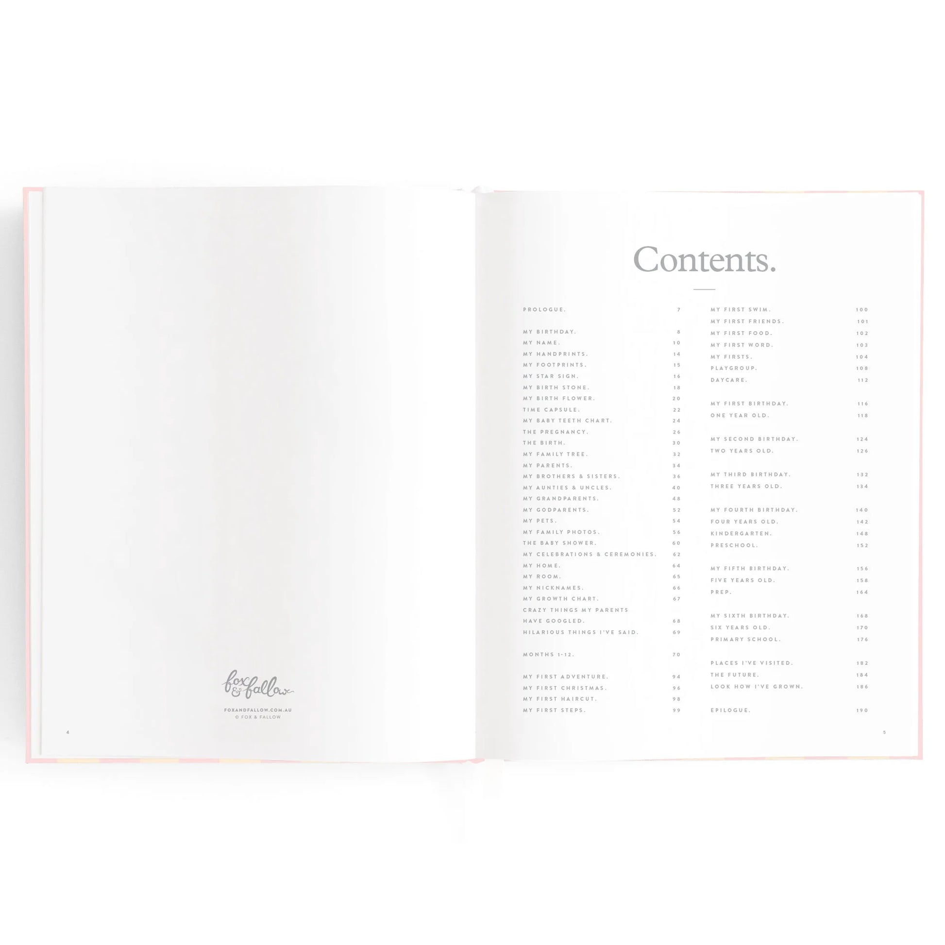 A beautiful keepsake for the whole family to enjoy. Includes: important milestones and firsts, family profiles, family tree and travel map, playgroup and daycare through to kindy and school years, time capsule, nicknames and celebrations, pets, friends, birthdays and more. 190 pages.