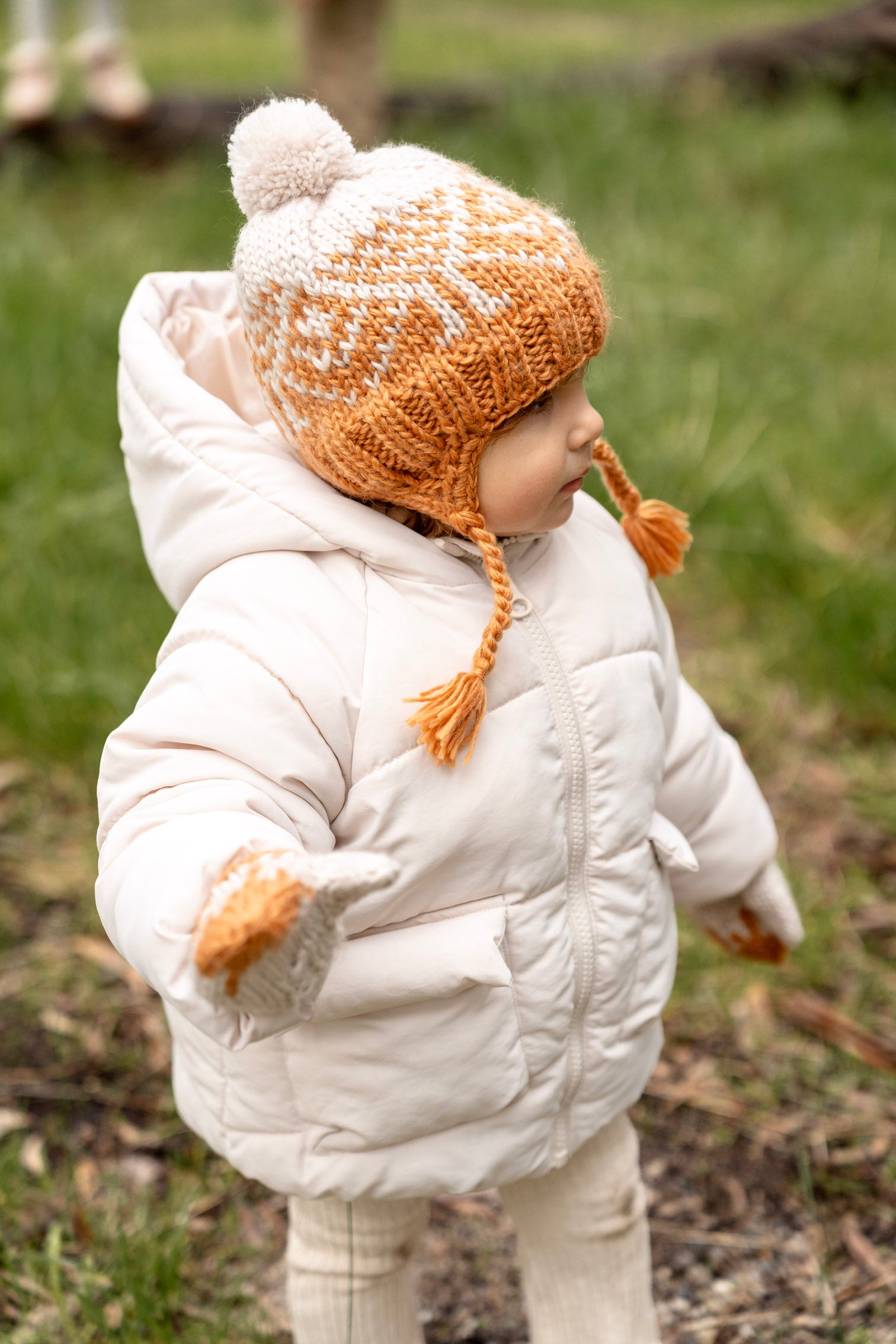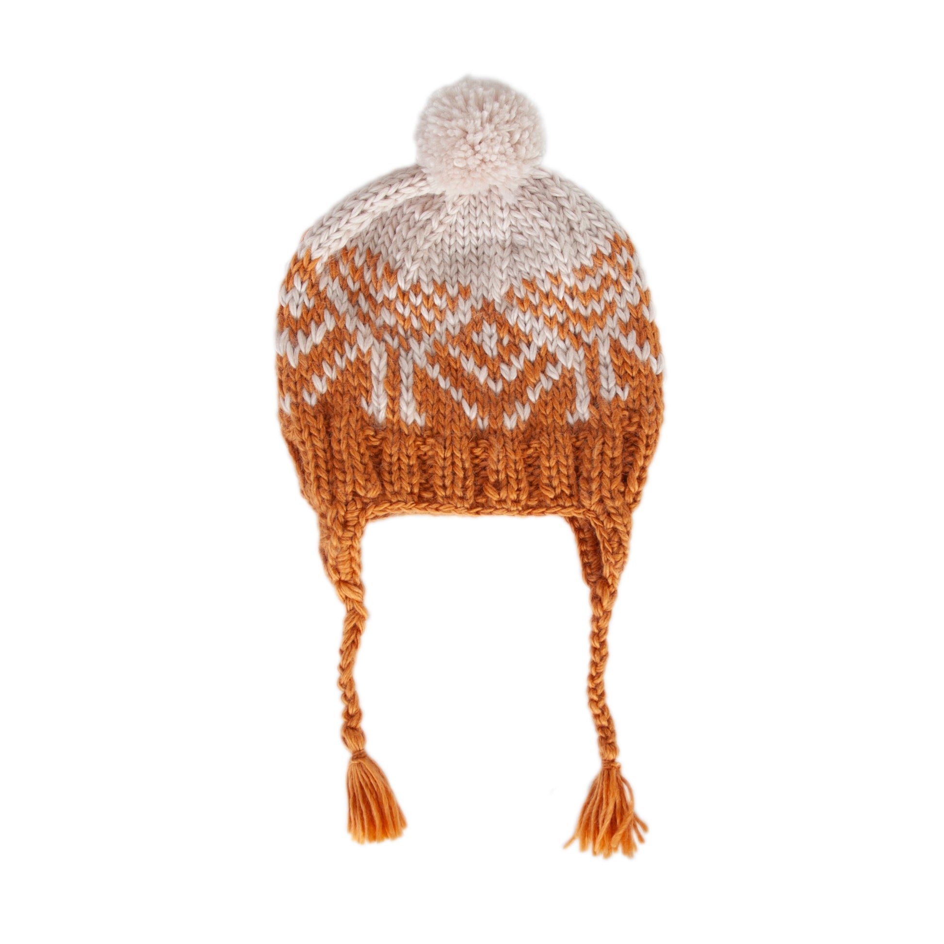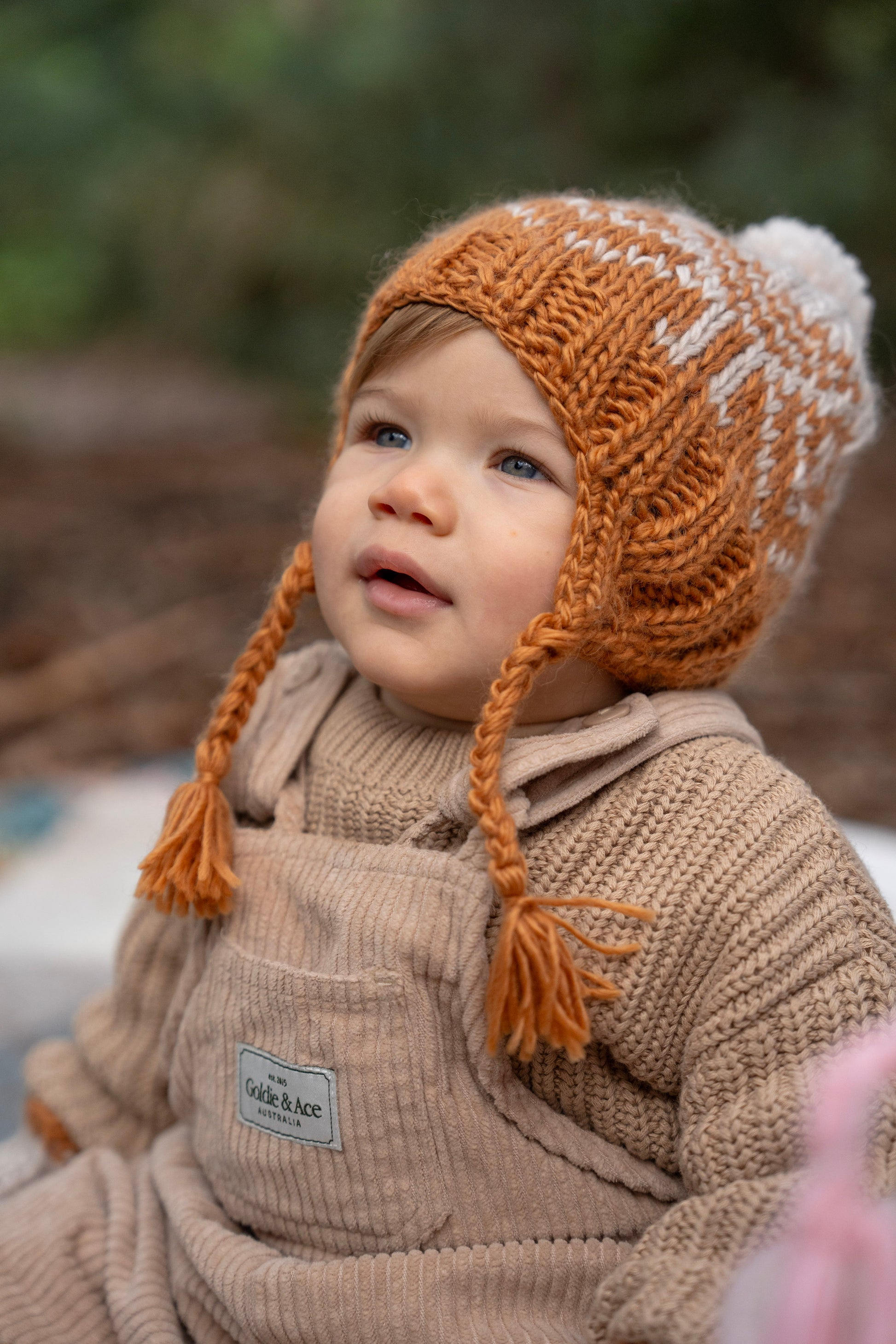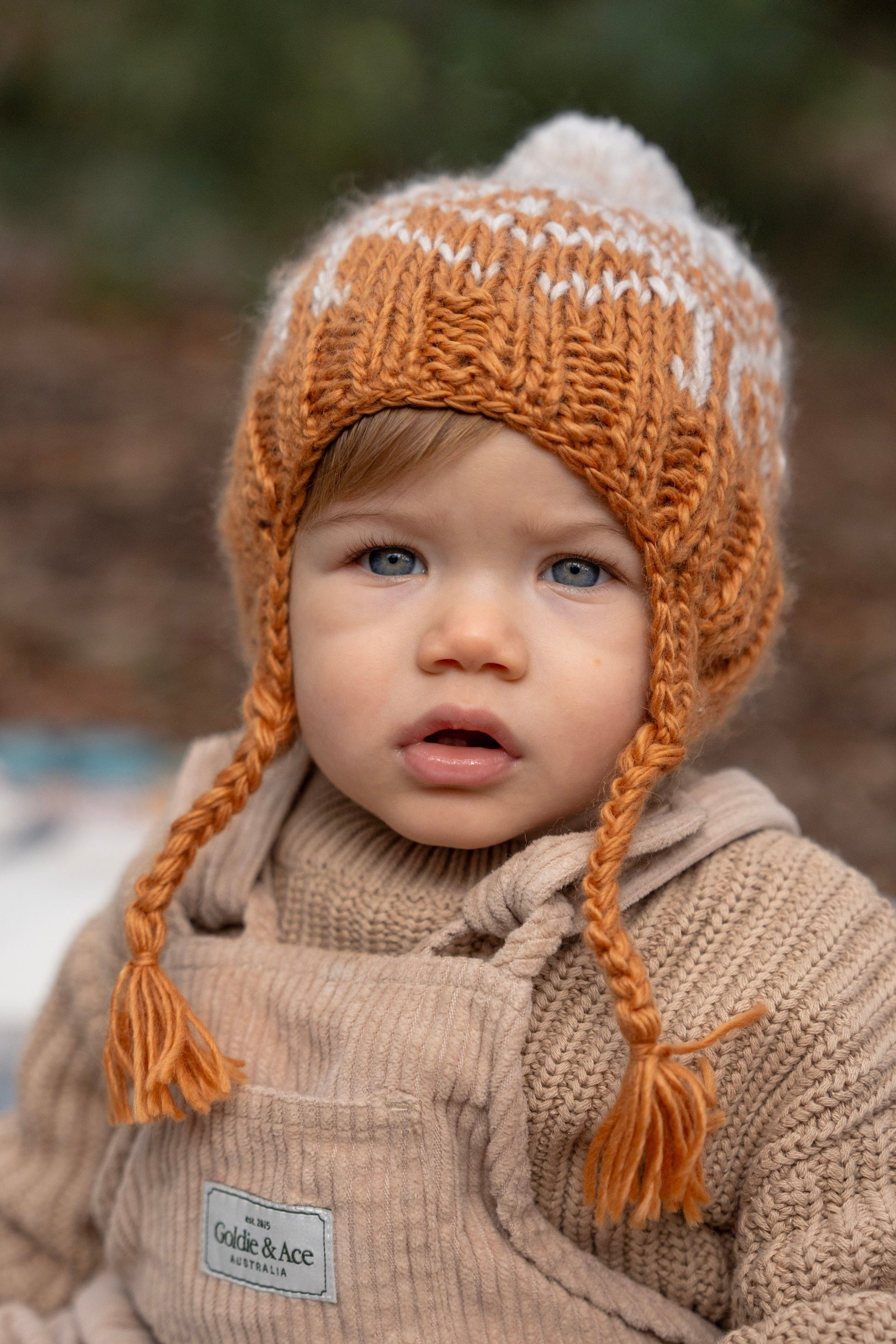This super soft wool blend Acorn Bjorn Beanie in Caramel has been designed in a nordic stitch pattern, cute plaited side ties and a comfortable and stretchy 2x2 ribbing at the face. The Knit beanie features a fun pom pom on top. Made with 30% Wool and 70% Acrylic yarn that is breathable, very soft on the skin and also durable.