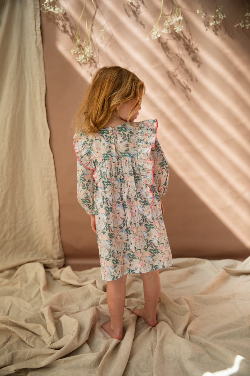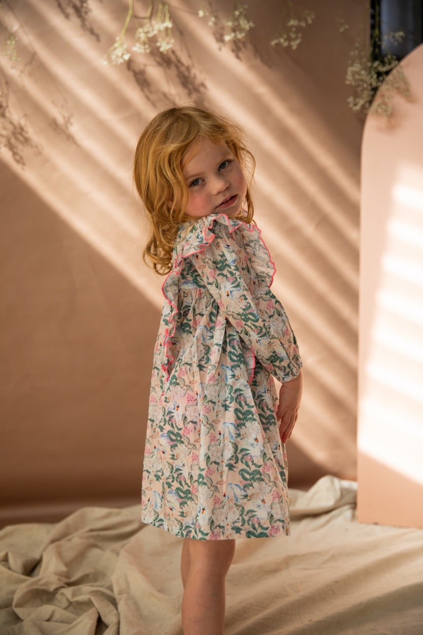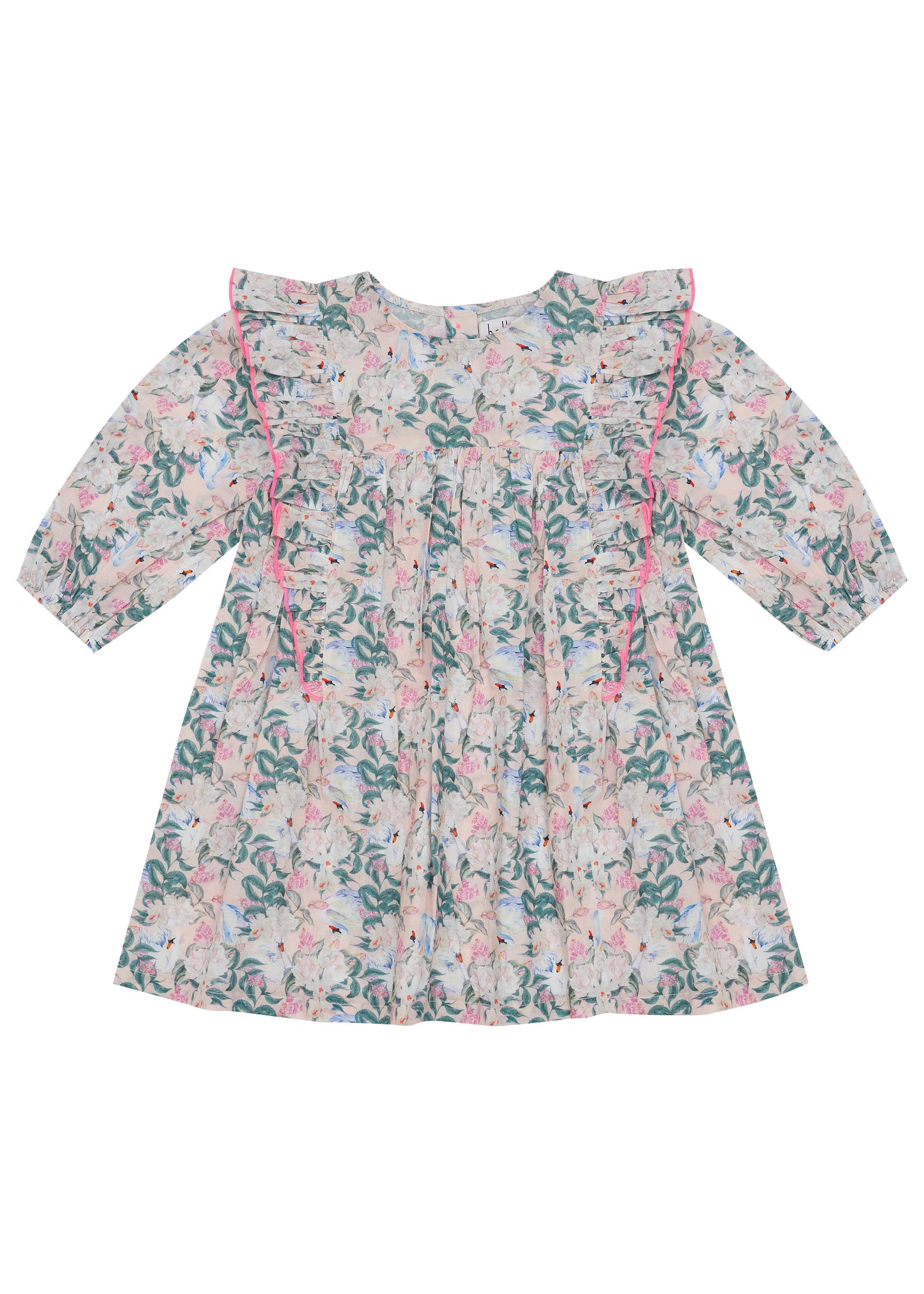 Pretty as a picture and twirly girl ready, but don’t worry Bella & Lace didn’t forget the pockets! The Agatha Dress in the delightful Hello Gorgeous Print features full sleeves with elasticated cuffs, front panel ruffles and beautiful gold button back closure. Crafted from a divine soft cotton voile fabric with the Hello Gorgeous Print design accented with neon pink trim. Layer over leggings for extra warmth. Perfect to match with her sister in her Primrose romper.