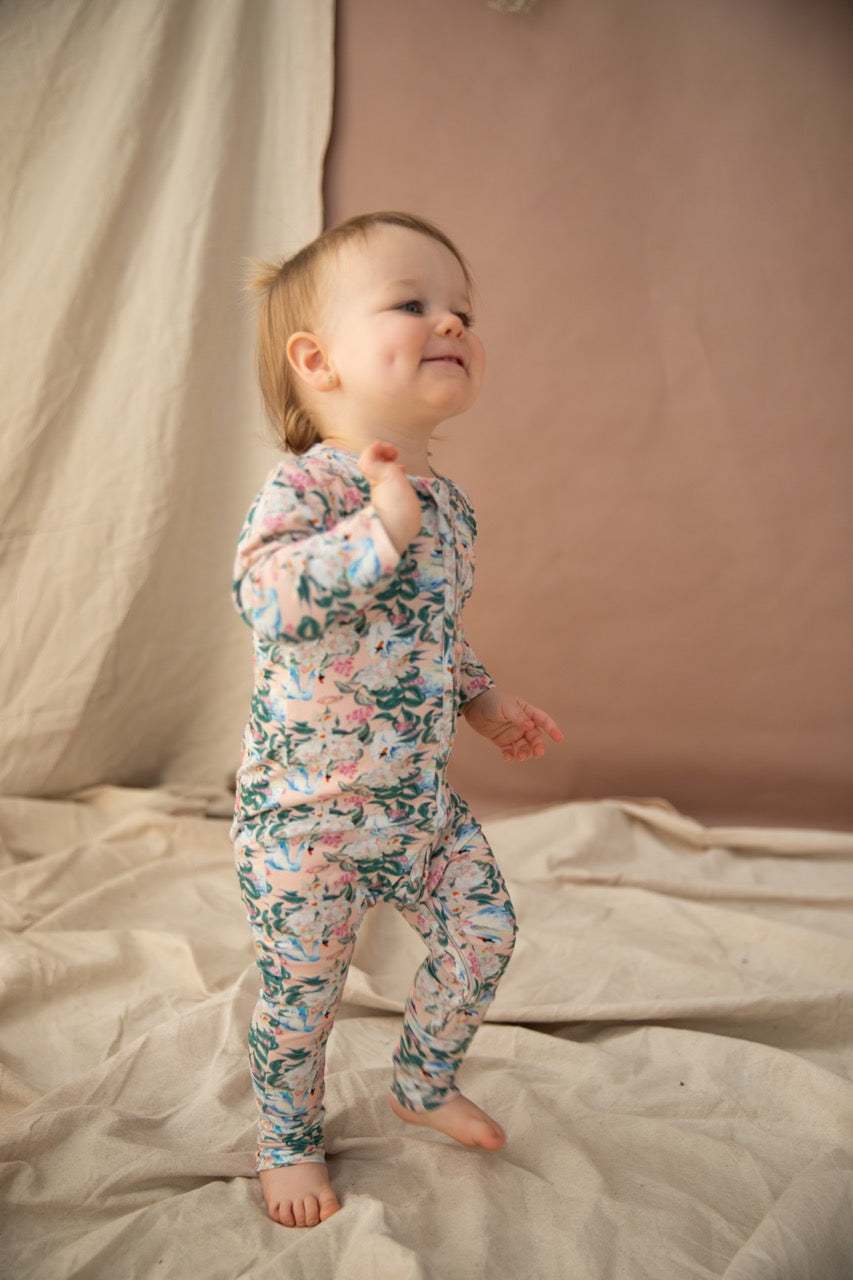 Perfect for snuggles, and cute as a button. The Jesse Romper in Hello Gorgeous Print from Bella & Lace. Features the divine Hello Gorgeous Print, on soft cotton elastane that has just the right amount of stretch for crawling, rolling, wiggling and tottering. Zip through front for easy dressing and nappy changes.