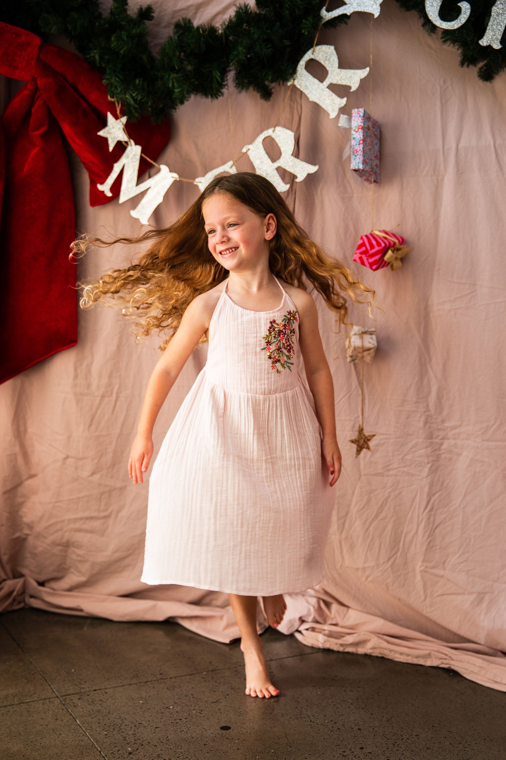 Perfect for snooping under Christmas trees and present rattling, the Bella and Lace Joy Dress in Ham features a halter tie top in a signature soft cotton double gauze, embroidered with festive blooms and finished with an aline skirt, fit for for twirling with the sugar plumb fairies.
