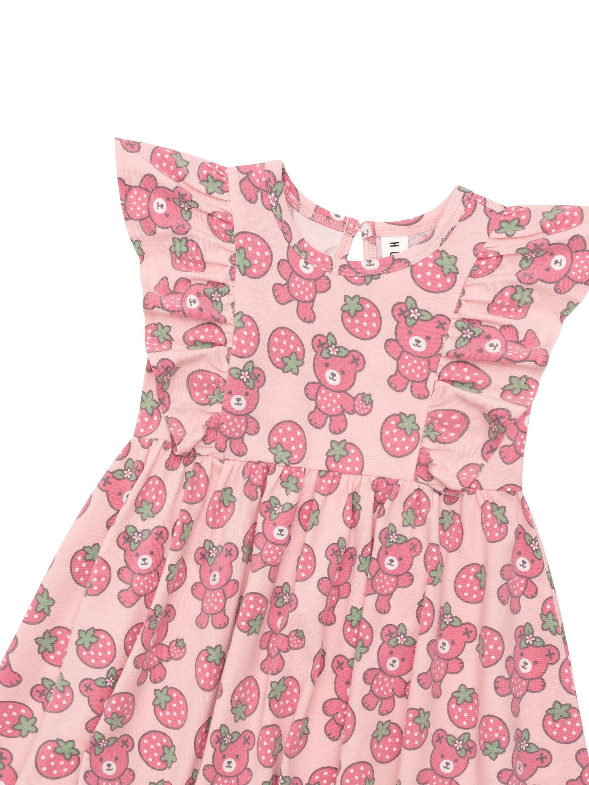 Get stylish with Huxbaby's Berry Bear Frill Dress in Candy! Made from soft, certified organic cotton, this dress features a playful berry bear print and frill sleeves. With a keyhole closure at the neck and safe dyes, it's the perfect blend of comfort and sustainability. Berry-licious!