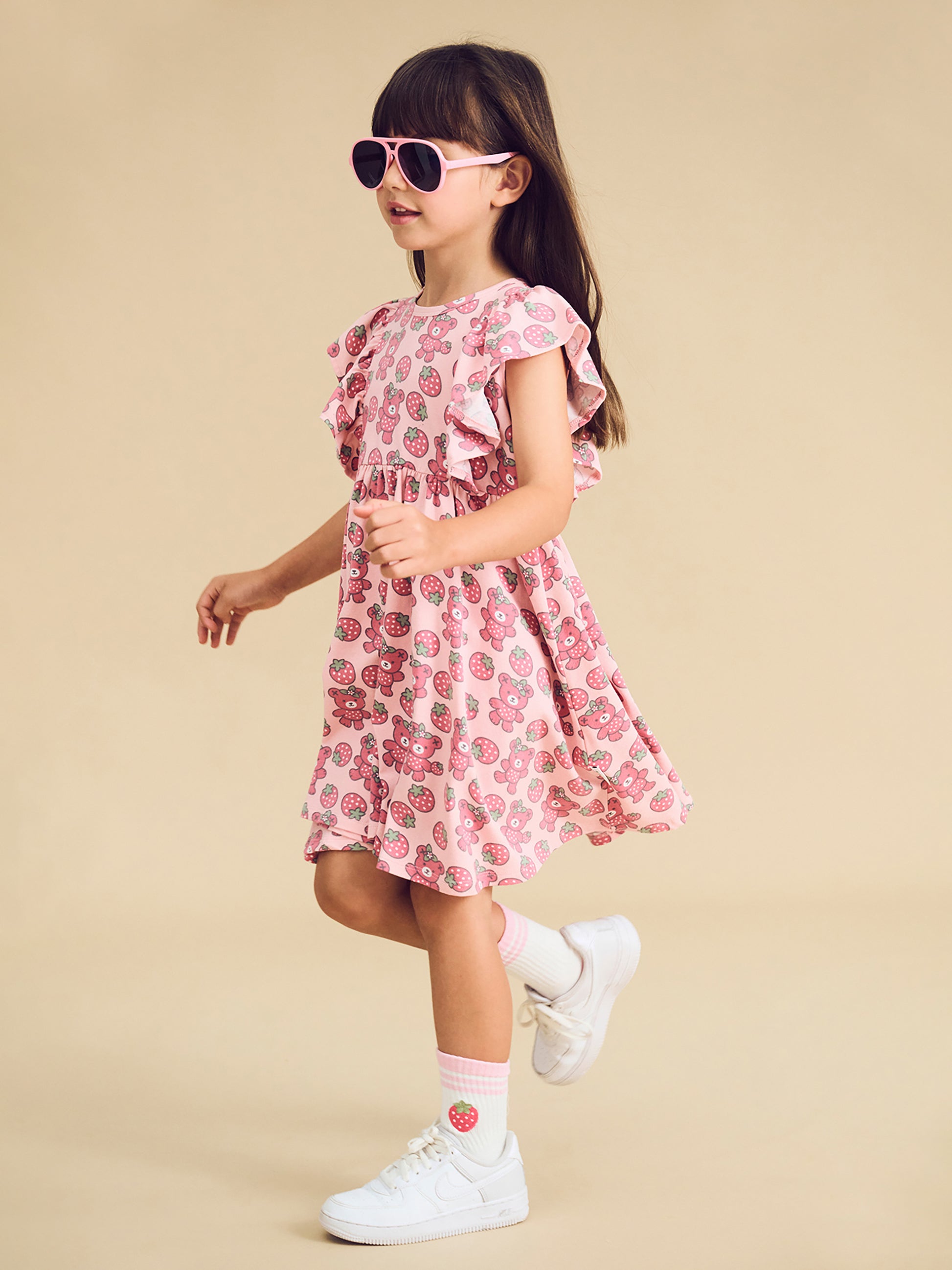 - Super soft, premium organic cotton jersey dress with all over berry bear print and frill sleeves
