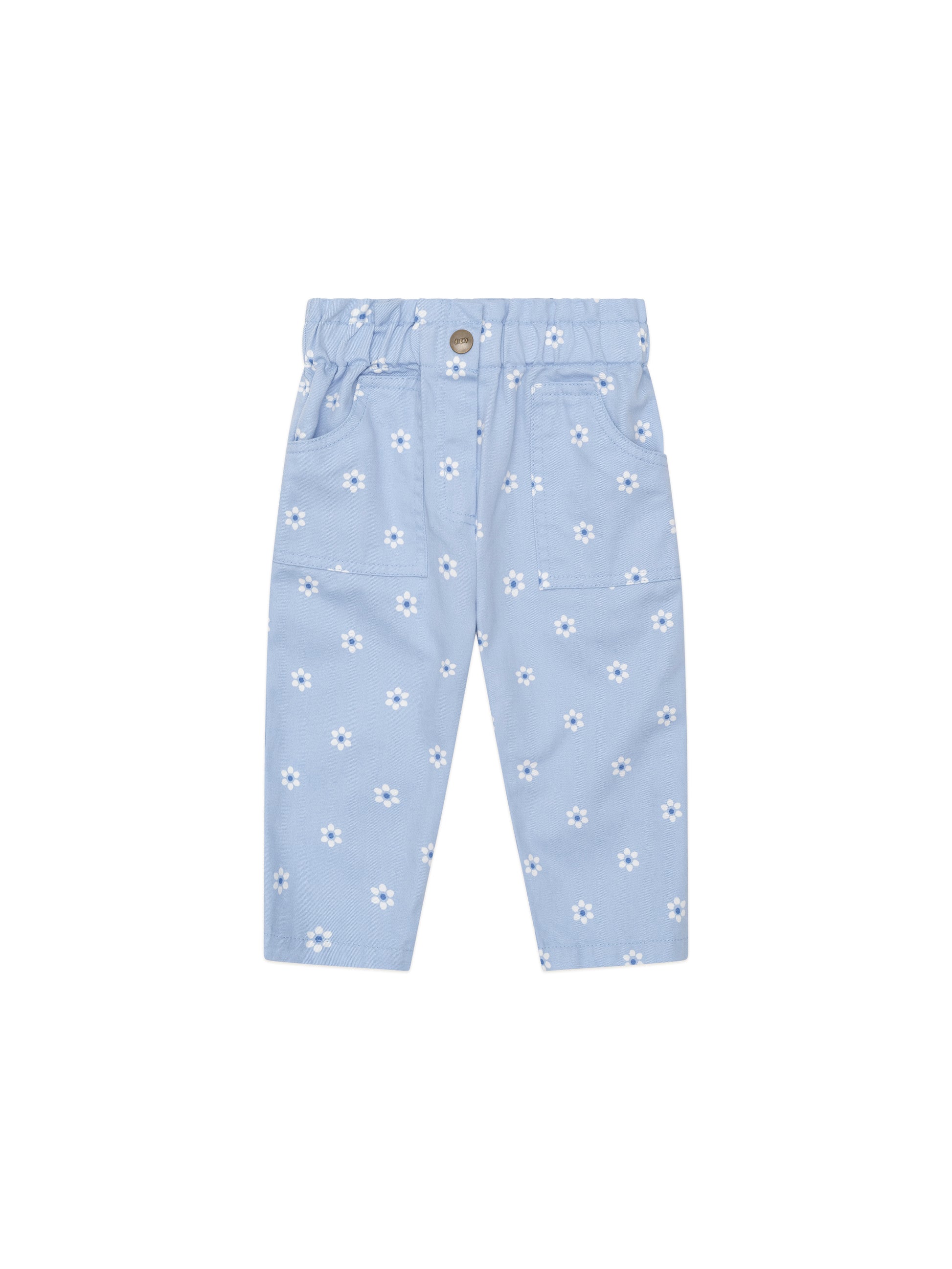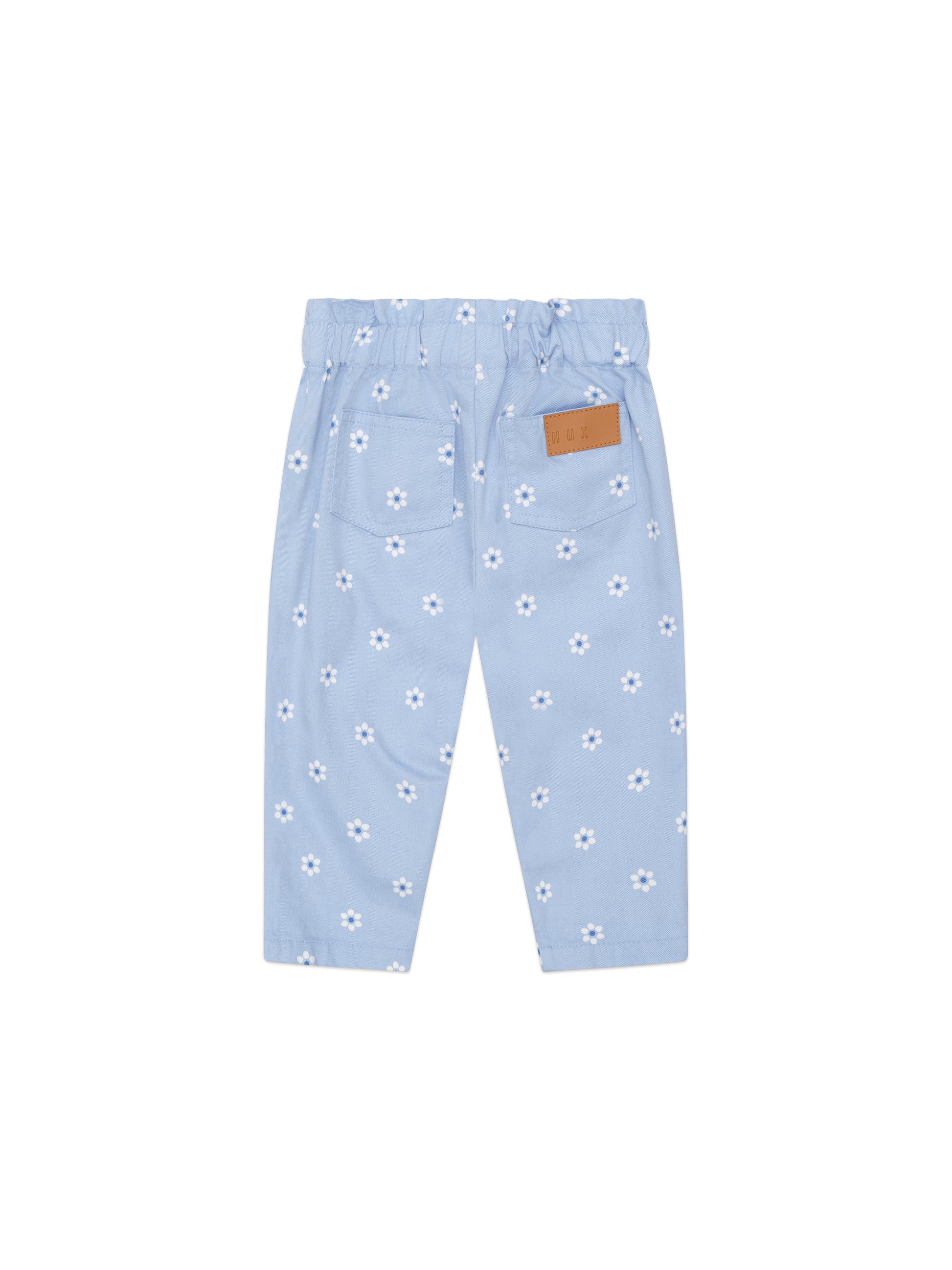 90s style paper bag pants in chambray blue and daisy print. Featuring an internal button and elasticated waistband for an adjustable fit, plus front and back pockets perfect for stashing snacks in, these everyday pants are comfy, cute and made for good.