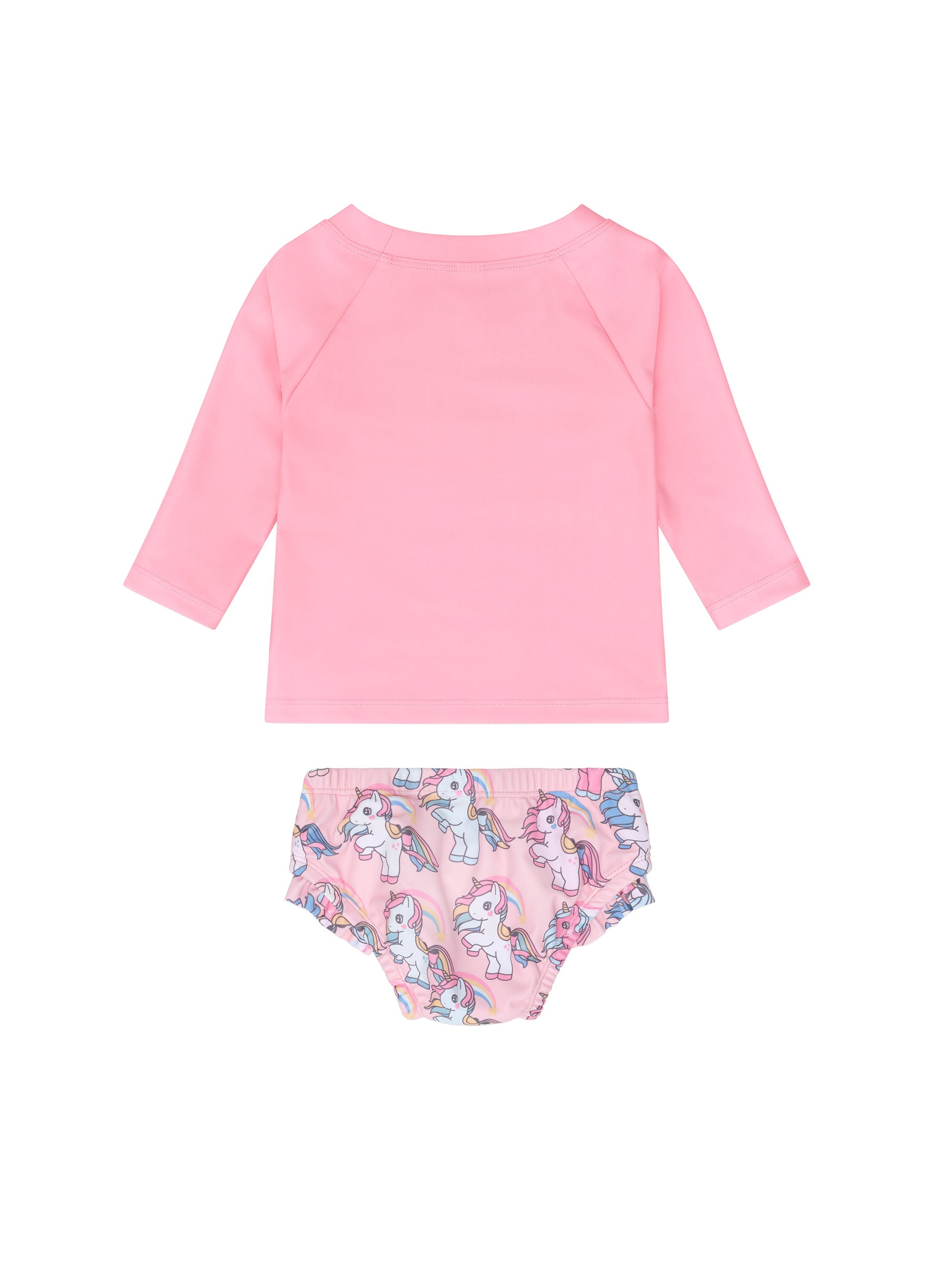 - 2 piece rashguard set with rainbow unicorn print and frill bottoms