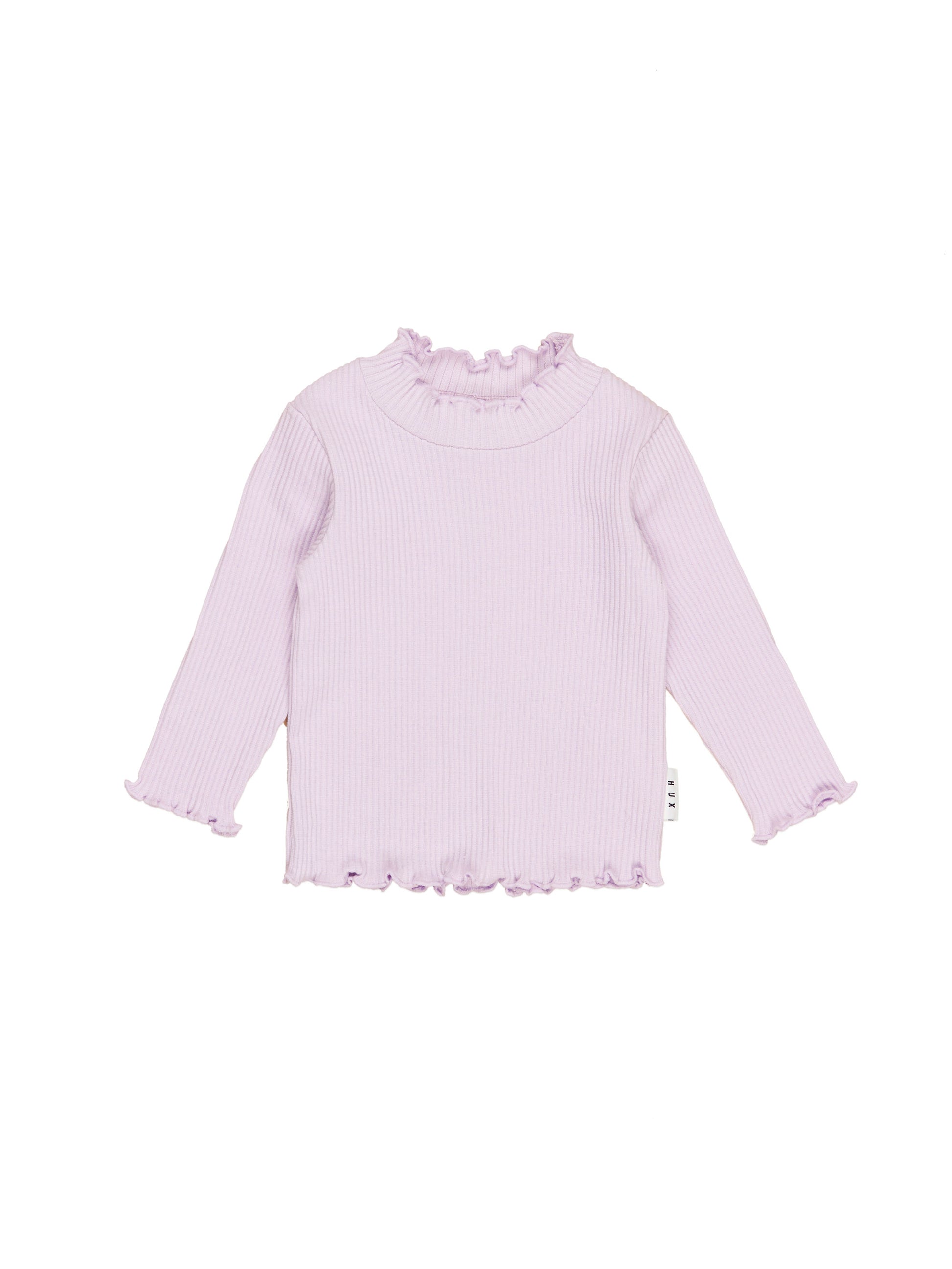 The Huxbaby Rib Skivvy in Bright Orchid is a lilac hue rosebud long sleeve rib top with lettuce edge sleeves and hem, perfect for layering. Made with 95% cotton and 5% elastane flat back rib, it is not only stylish but also safe with AZO free dyes. Keep it looking great with a cold gentle machine wash.
