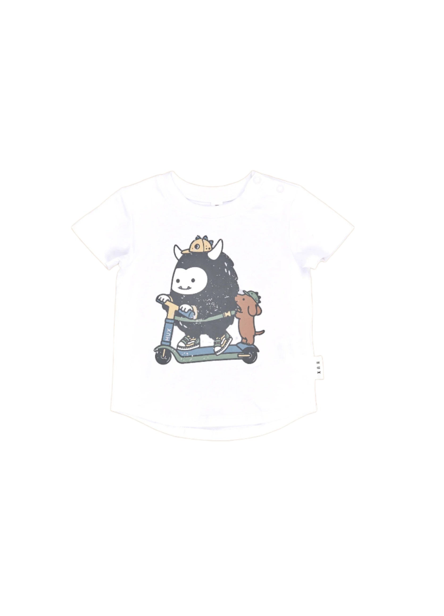 Get your little one ready for adventure with the Huxbaby Scooter Monster T-Shirt in White. Crafted from premium organic cotton with super soft jersey, this T-shirt features a playful scooter monster print that your little one will adore. Perfect for sensitive skin, it's GOTS certified and has stainless steel snaps on size 6-12 months to 1 year for easy dressing. Let their imagination roll!