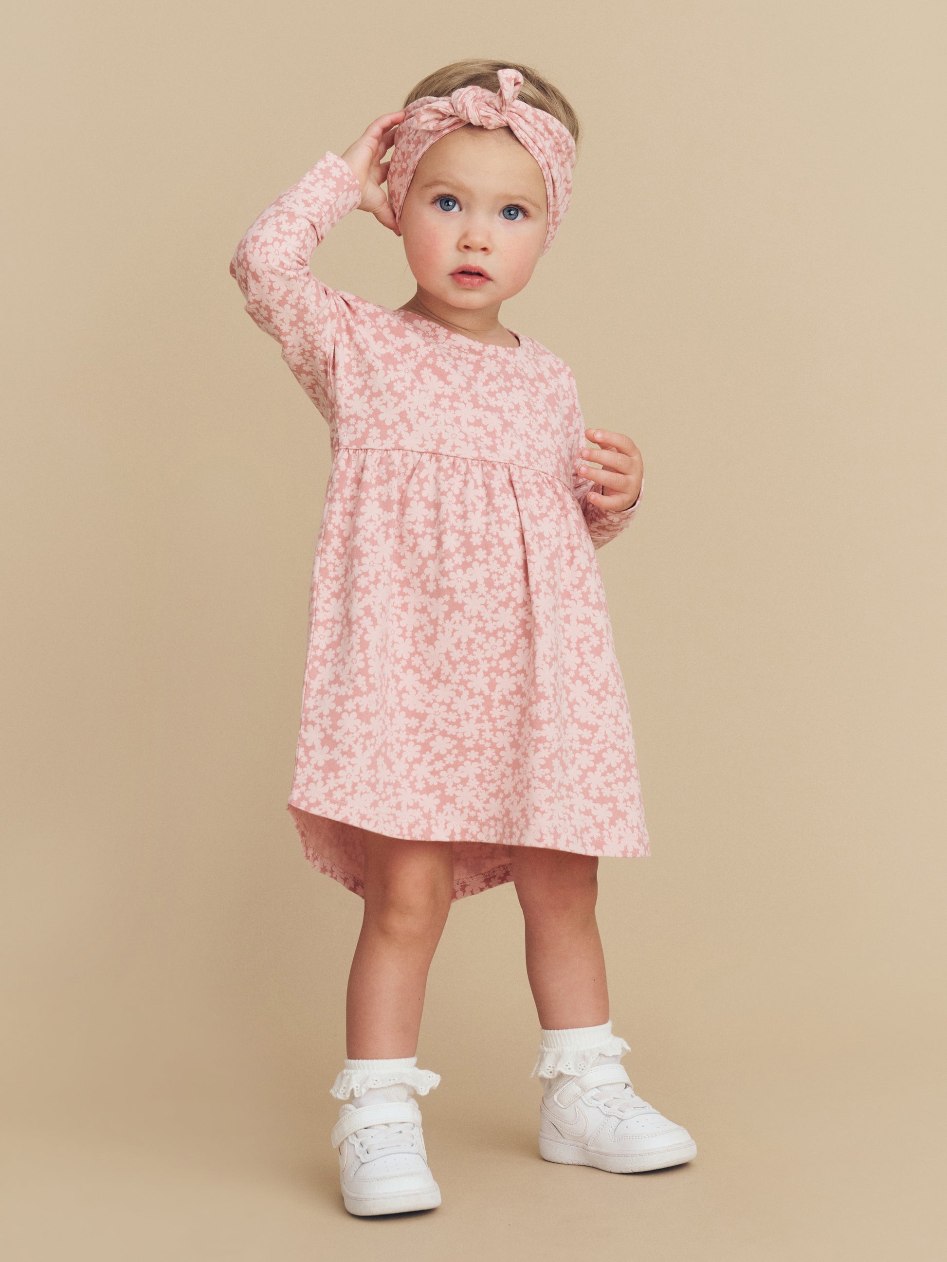 Super cute premium organic cotton elastane jersey Smile Floral 2 pack Headband in Dusty Rose from Huxbaby one headband featuring an all over smile floral print and the other a matching solid rose colour. The elastic-back construction and adjustable fit make these headbands comfy and secure for all-day wear.