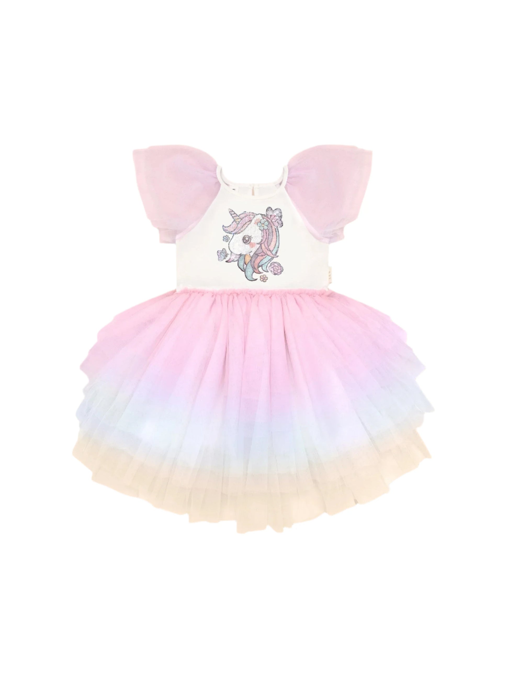 - Tiered rainbow tulle party dress with sequin unicorn design