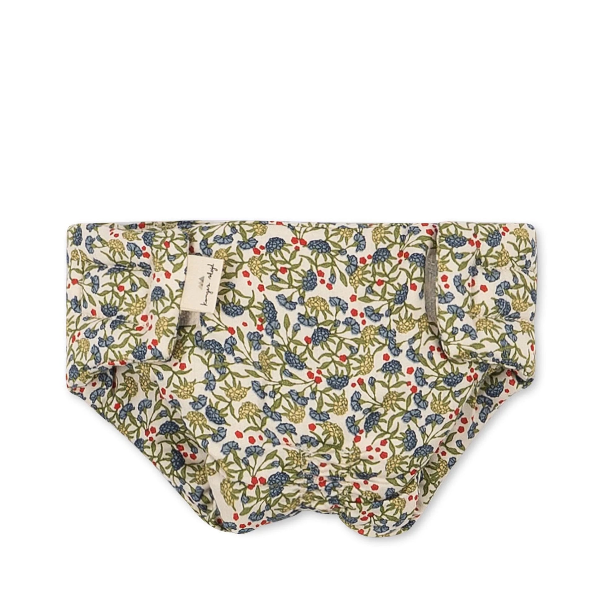 Bib, nappy with velcro closure and muslin cloth kept in a small carry bag for baby dolls made with 100% organic cotton, featuring a beautiful unique Konges Sløjd floral print. Perfect for imaginary play, looking after baby dolls, paired with the Konges Sløjd Doll Bouncer, Stroller, Table Chair, Dolls bag and Dolls carry cot in the same print.