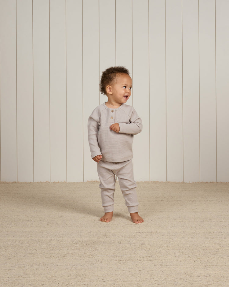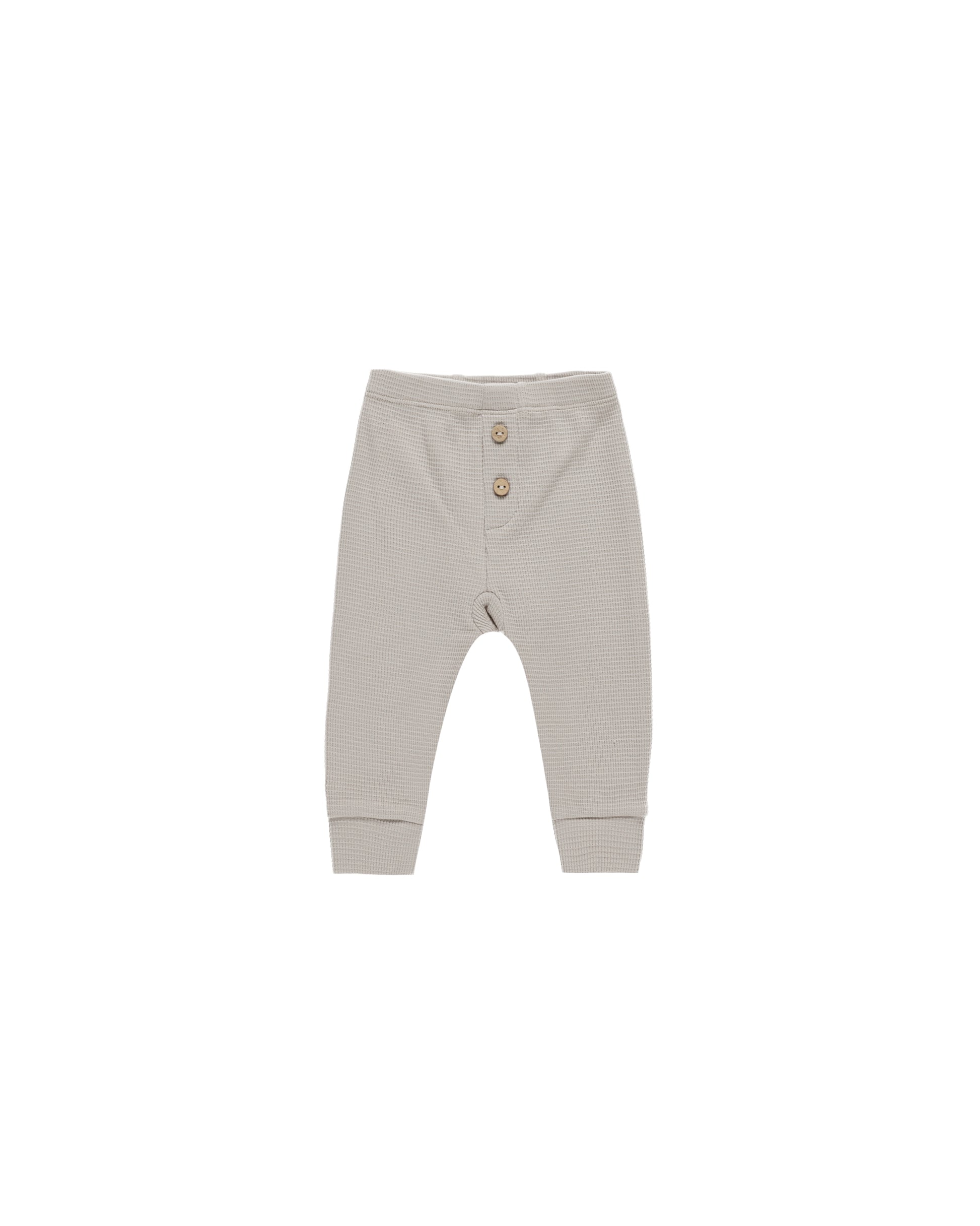 Organic cotton legging with elastic waistband and coconut button detailing at front.