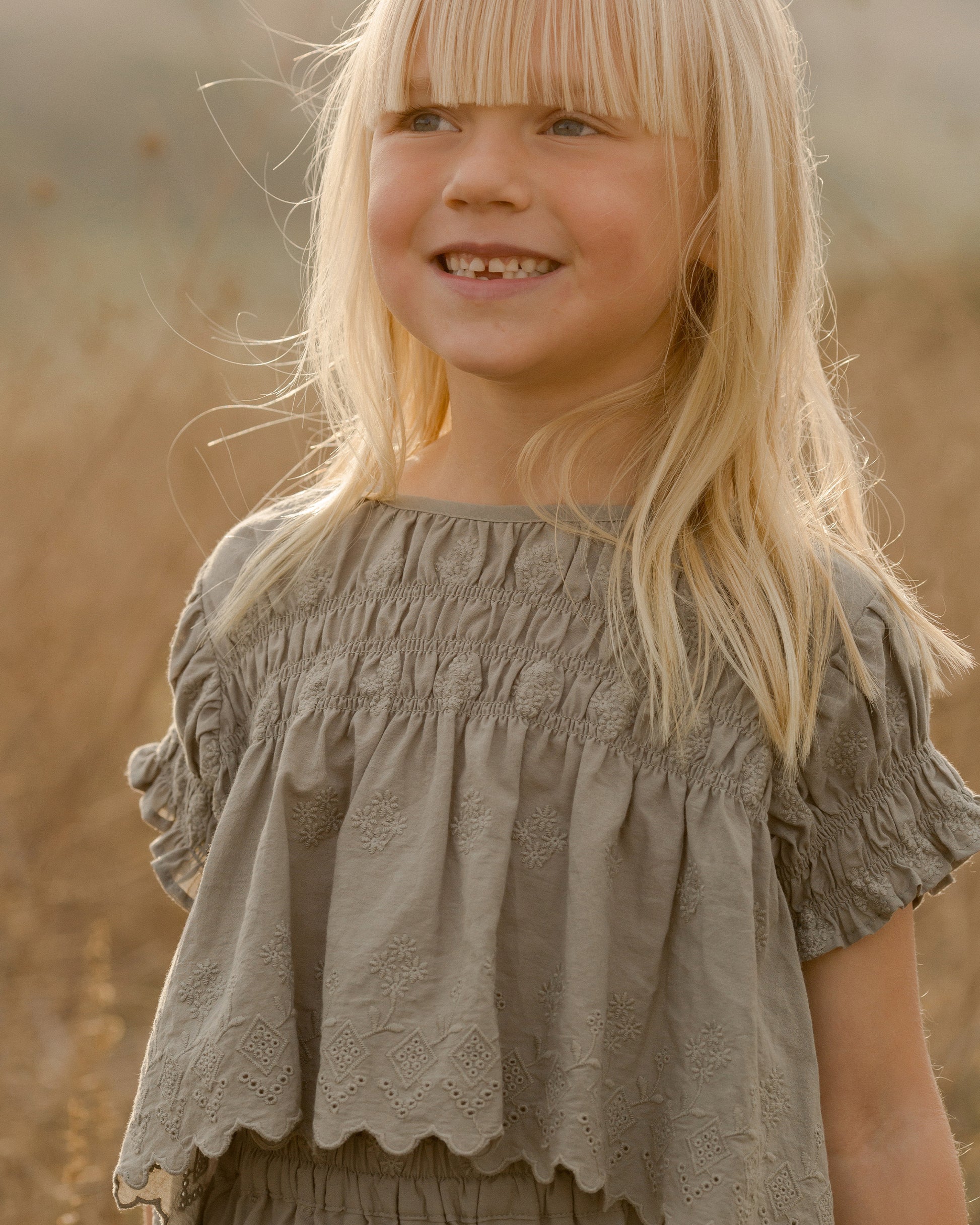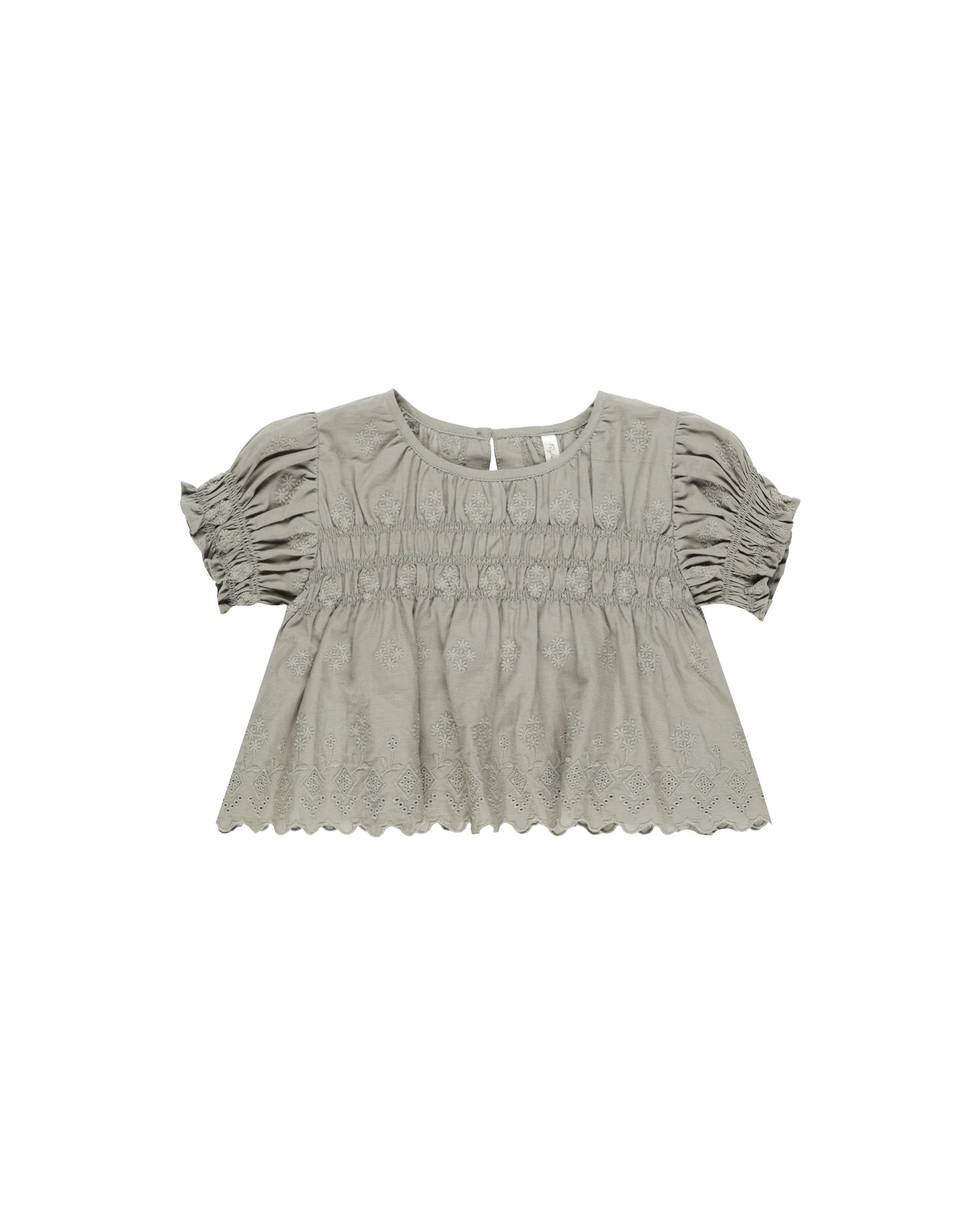 The lovely Colette Top in Laurel from Rylee + Cru features a charming embroidered scallop edge, smocked detailing at the neckline and sleeves for a comfortable fit.