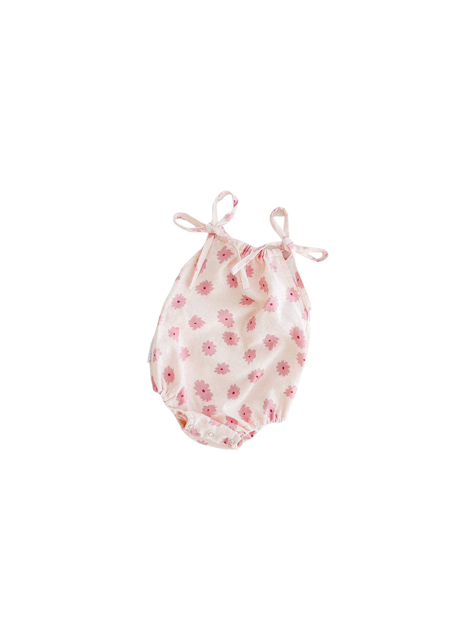 A lightweight linen blend romper featuring our Rosa printed design. Functional ties at shoulder and snap buttons at the crotch for easy on/off and nappy changes