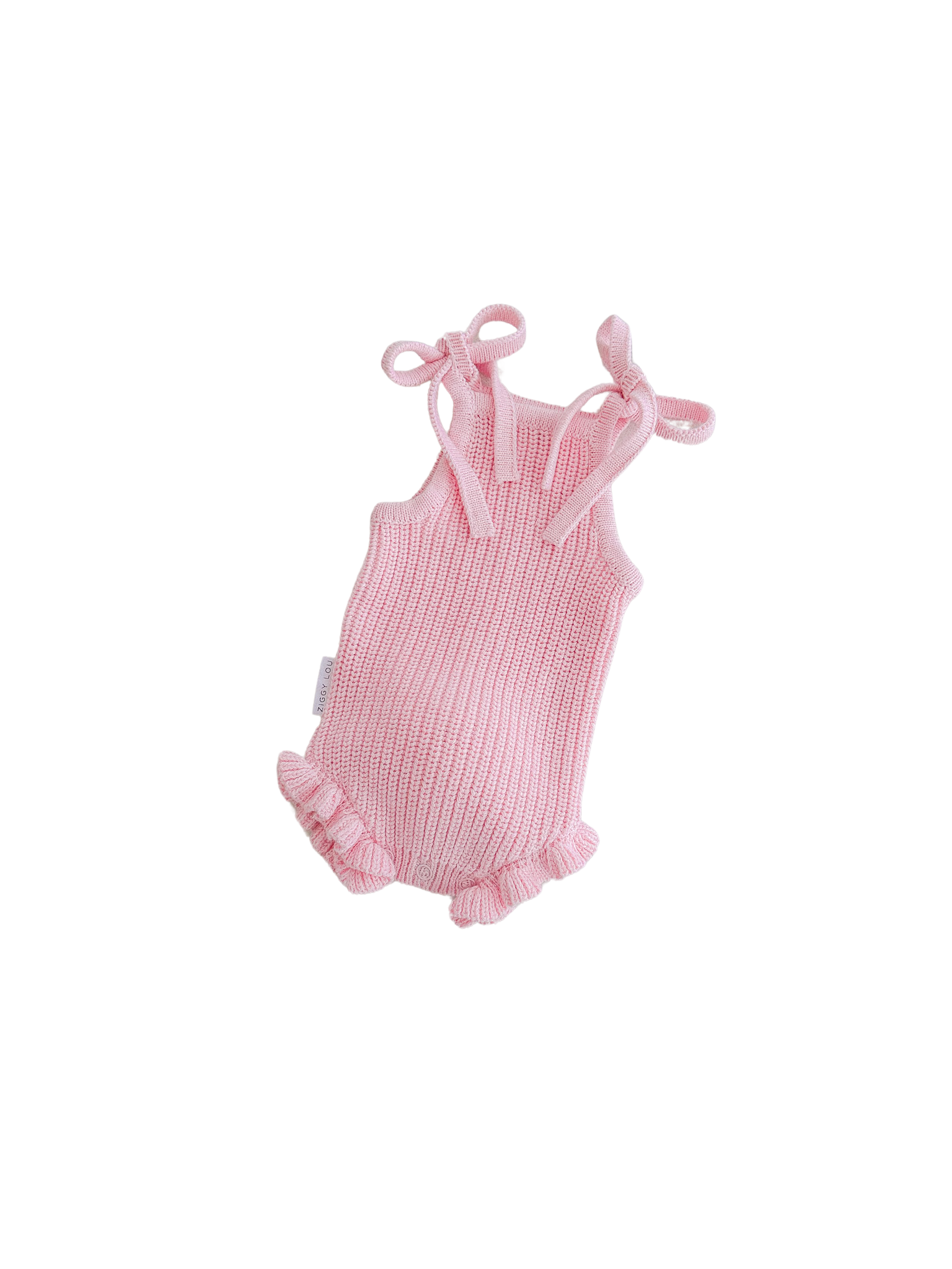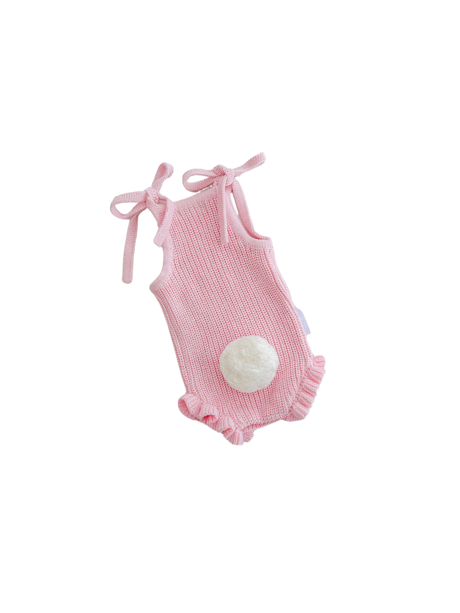 Chunky knit frill bodysuit in our two tone Dahlia colour featuring a removable bunny tail (press snap). Frill leg detail and adjustable ties at shoulder. Press snaps at crotch for easy nappy changes. Match with items from our Dahlia Easter Collection.